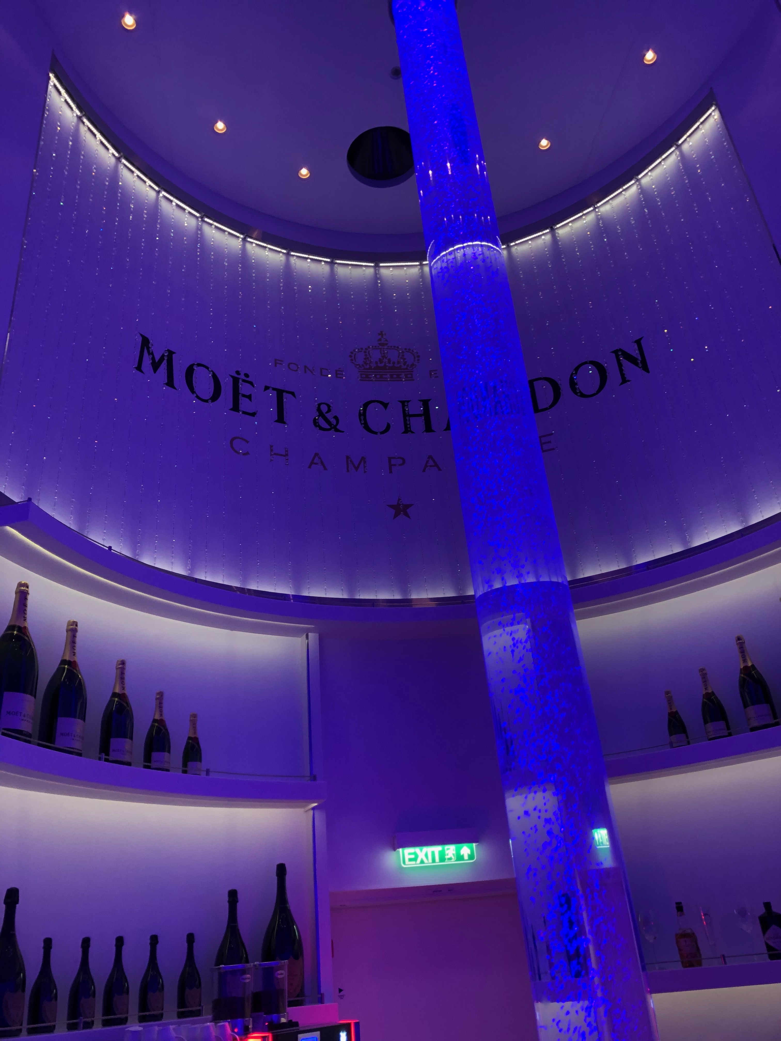 Kurz vor 22 Uhr gehen wir zum Nightfly, nennen unsere Kabinennummer und werden zu unserem Vierertisch direkt vor der Bühne gebracht… Zufälle gibt es, ungeplant warten dort schon unsere Bekanntschaften aus der Seenotrettungsübung vom Vorabend! Wir lachen alle kurz, stoßen mit dem für die 10,00 Euro Reservierungsgebühr inkludierten Champagner an und haben einen tollen Abend!