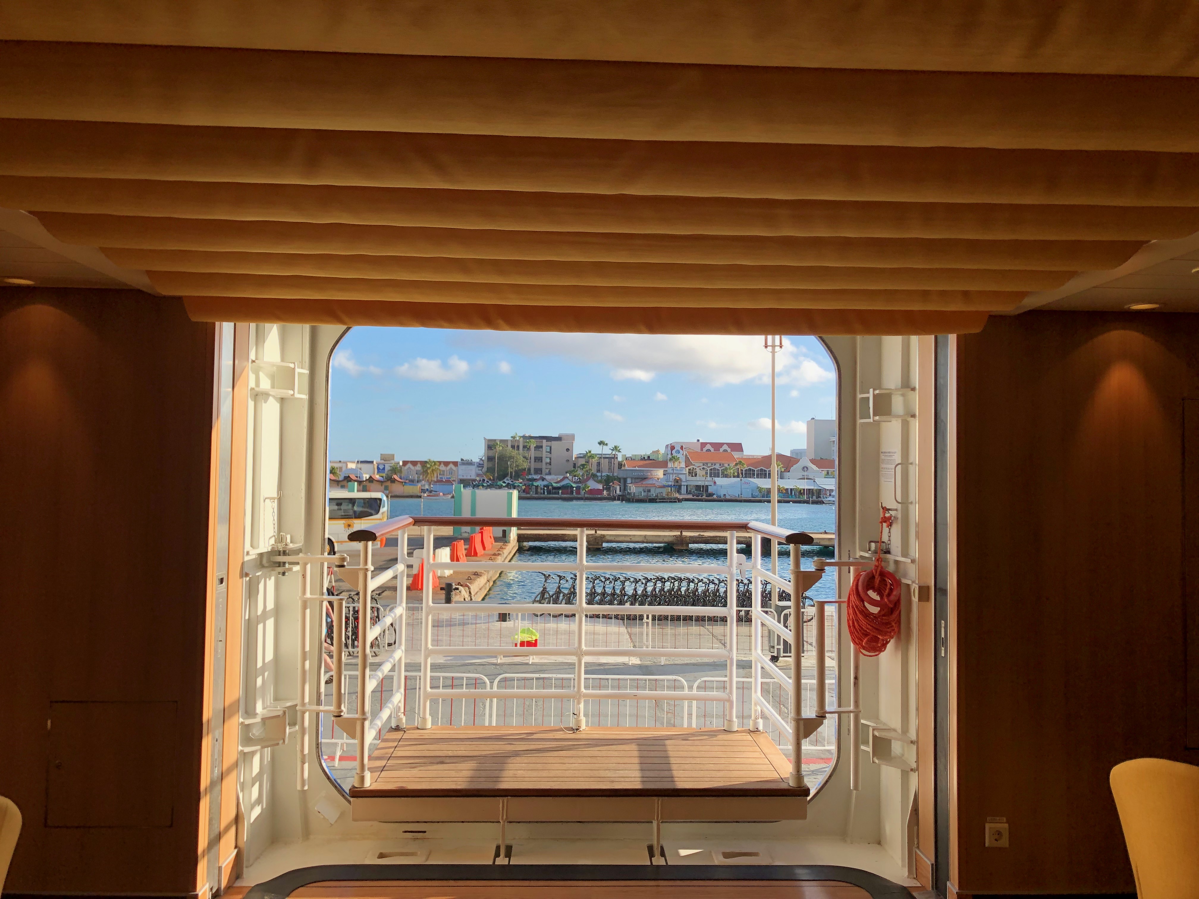 Früh morgens hat der Kapitän AIDAperla als Erste am Cruiseterminal der Oranjestad Marina festgemacht. Während wir unsere angestammten Plätze auf der Außenterrasse des „Weite Welt“-Restaurants eingenommen haben schauen wir zu, wie die Norwegian Gem einige Zeit später hinter uns einparkt. Später am Tag wird auch noch die Veendam der Holland America Line folgen.