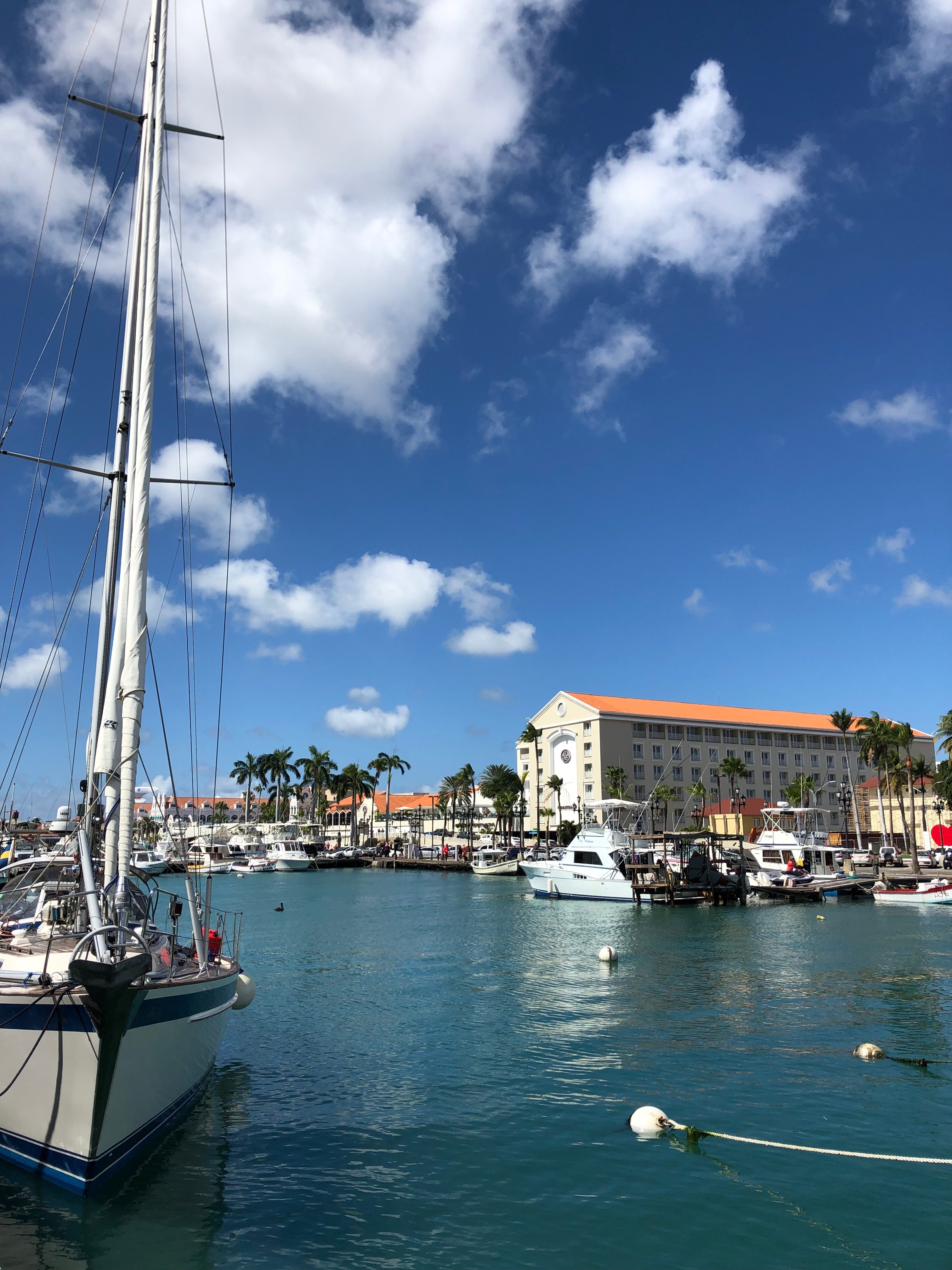 Wir schlendern durch die Einkaufsstraße Caya G.F. Betico Croes mit Ihrer berühmten Straßenbahn, schauen uns das Anne-Frank-Denkmal sowie die frei lebenden großen Leguane im Wilhelmina Park an, trinken einen Kaffee in der daneben liegenden Strandbar „The West Deck“ und schlendern zurück zum Hafen. Im Vorwege hatte ich gelesen, dass Aruba eine Art „Mallorca“ oder „Ibiza“ für die Amerikaner sein soll, und diesen Eindruck kann ich bestätigen… Es gibt ein großes Hotel mit Casino, das „Renaissance Aruba“ mit einer zugehörigen Mall, und überall in der Stadt findet man auch von uns bekanntes… Tommy Hilfiger, Boss, ein Hardrock Café McDonalds, DunkinDonut, Starbucks, ein großes Kino und so weiter und so fort. Vielfach weht die niederländische Fahne, was vor den angepflanzten Palmen einfach sehr fehl am Platz ausschaut, und insgesamt wirkt Oranjestad größtenteils sehr ordentlich und gepflegt. Halt ganz anders als die bisherigen Inseln…