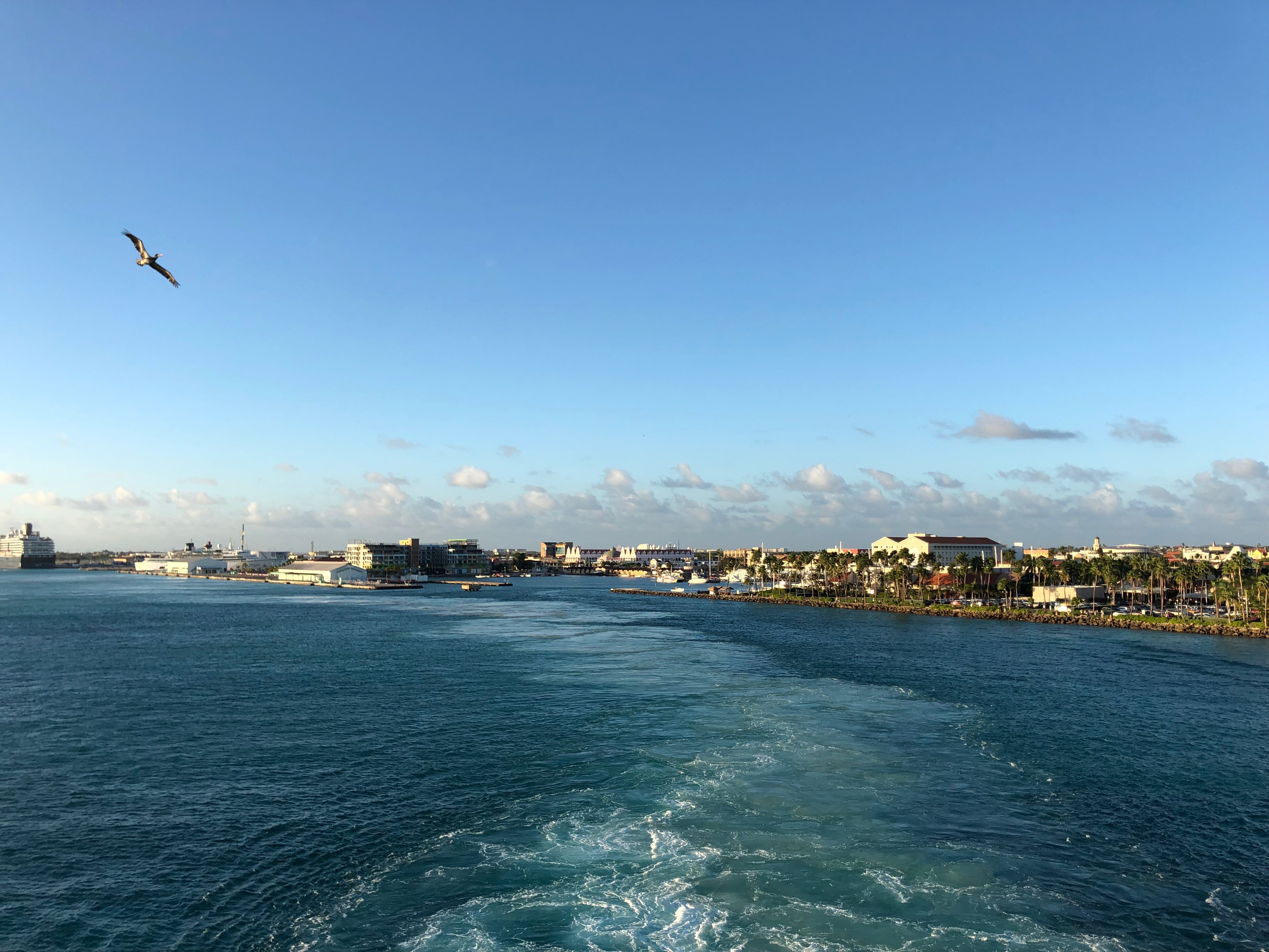 Das Auslaufen mit der langsam untergehenden Sonne verbreitet heute eine wirklich tolle Stimmung und wir können einen letzten Blick auf das schöne Oranjestad werfen, können den Flugzeugen im Anflug auf den Queen Beatrix International Airport zuschauen und lauschen der Auslaufmusik.