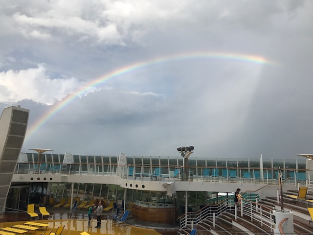 Auf dem Pooldeck angekommen müssen wir feststellen, dass es wieder geregnet hat. Okay, heute ist zwar der erste Tag aber ein bisschen Sonne während der Reise würden wir uns dann doch wünschen. Die Bräune der sich bereits seit New York auf dem Schiff befindenden Mitreisenden, lässt jedenfalls Hoffnung zu. Immerhin sehen wir dann noch mitten über dem Pooldeck einen Regenbogen auftauchen.
