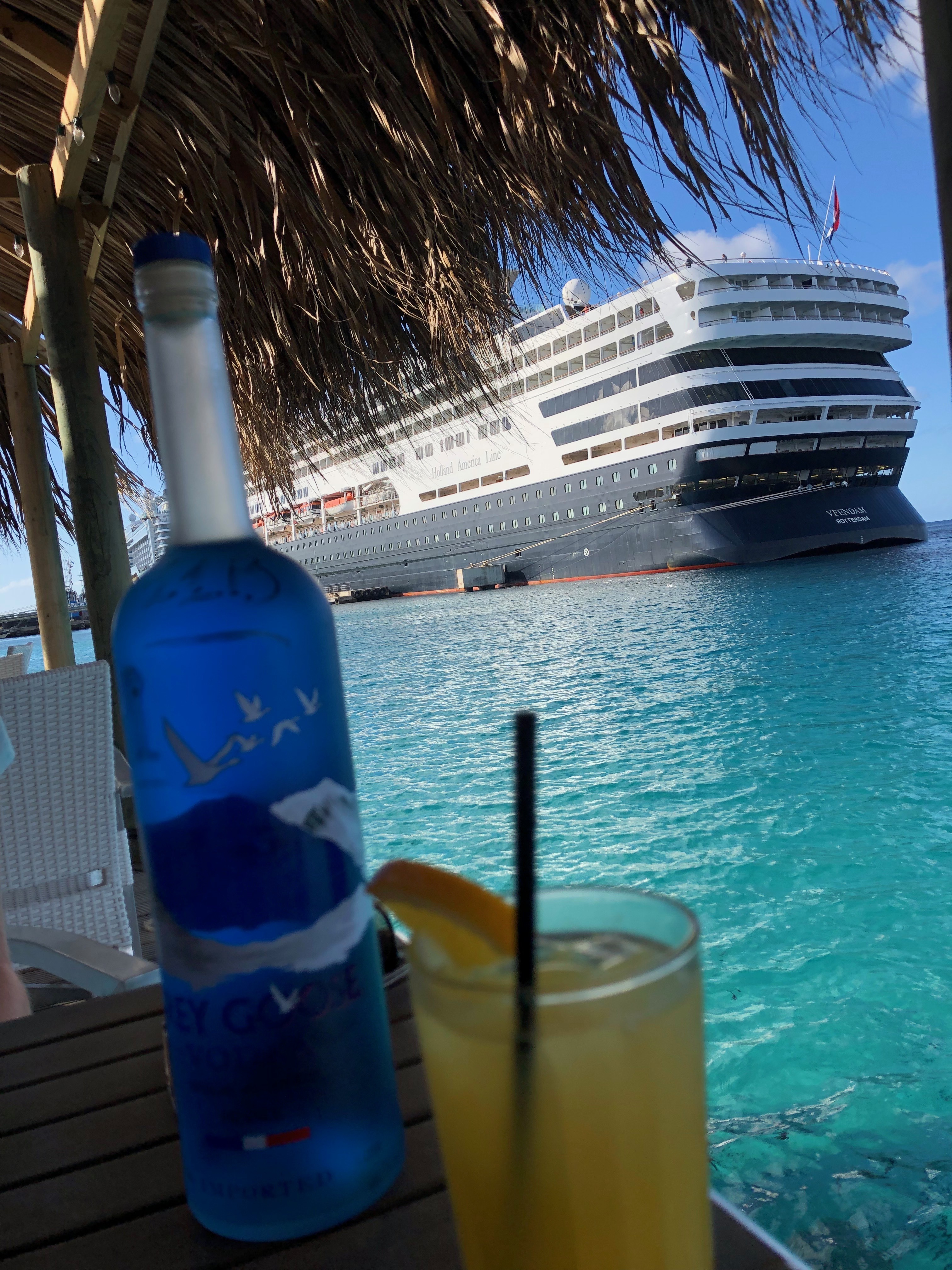 Da wir bis 10 Uhr, ab dann haben wir den Roller, noch viel Zeit haben setzen wir uns an Karels Beach Bar, trinken einen Kaffee und einen frisch gepressten O-Saft und sind einfach nur glücklich. Wir haben ein tollen Blick auf türkisblaues Wasser, das Heck der Veendam und die vorgelagerte Insel Klein Bonaire, zu der von hier auch Wassertaxen abfahren.