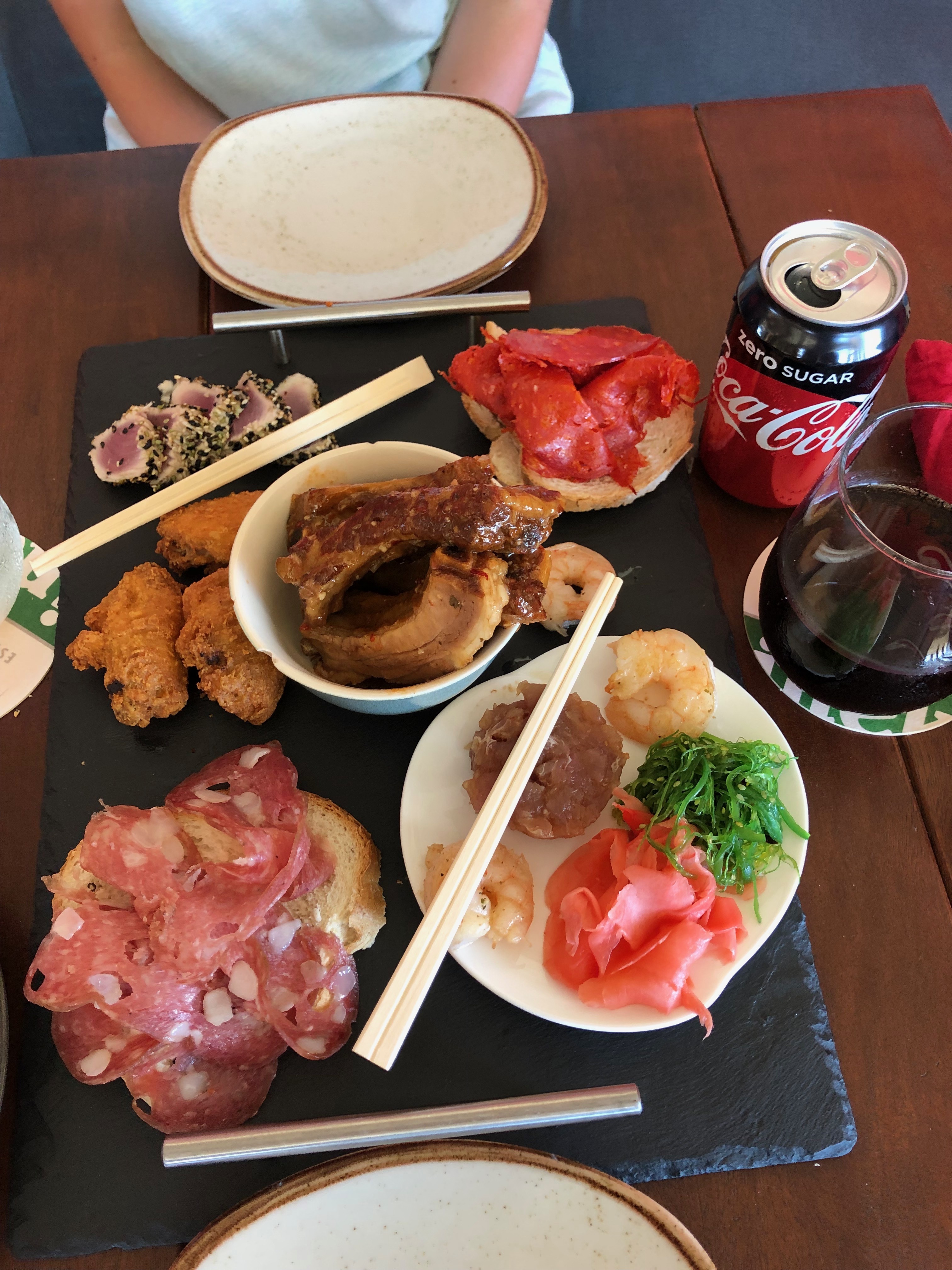 Wir bestellen eine Mixed-Plate für zwei, dazu ein wenig Brot und Dips, welche uns die Bedienung empfiehlt und werden von einer Art „karibischen Tapasplatte“ überrascht, mit Thunfisch, Lachs, Gemüse, Chickenwings und vielem mehr… das ist alles verdammt lecker und wir bereuen die Entscheidung nicht, hier gehalten zu haben. Lokales Essen gehört für uns auf Reisen einfach dazu.