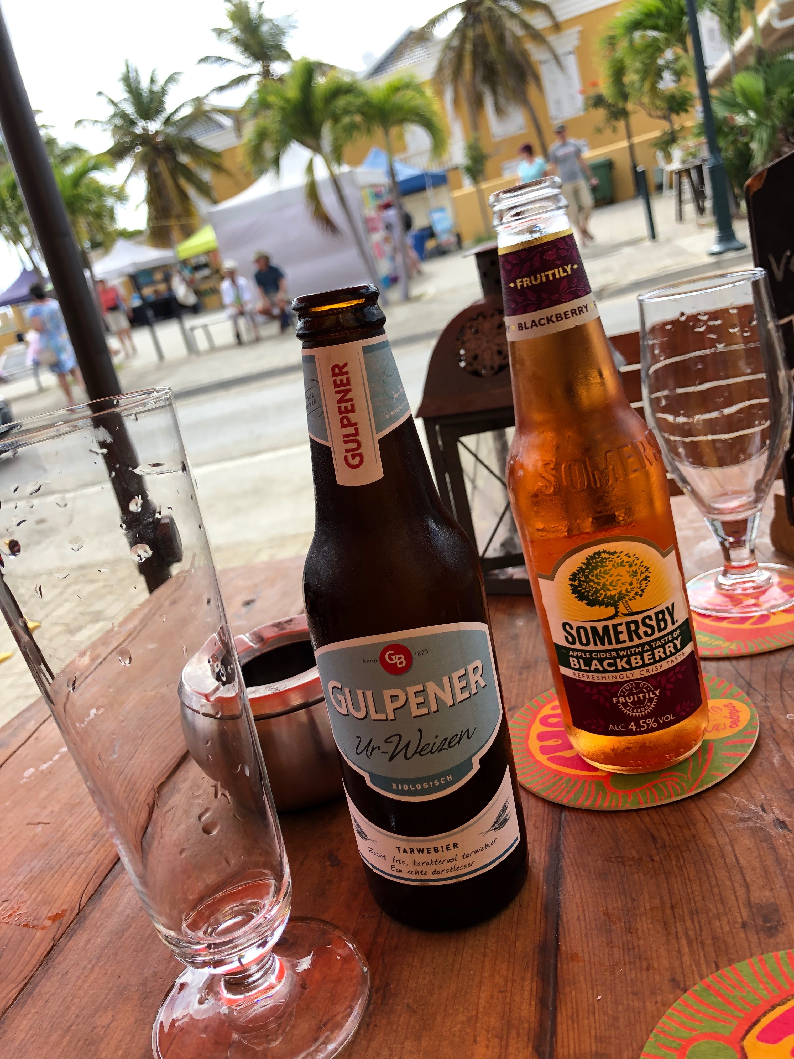 Zurück in Kralendijk hat mittlerweile auch die Brauerei geöffnet, und trotz des großen Andranges finden wir draußen zwei Plätze und genießen ein kühles „Feierabend“-Bier! Zumindest ich probiere mich an dem weniger bekannten uns sehr leckeren Gulpener Ur-Weizen, während meine Freundin auf ein altbekanntes Somersby zurück greift.