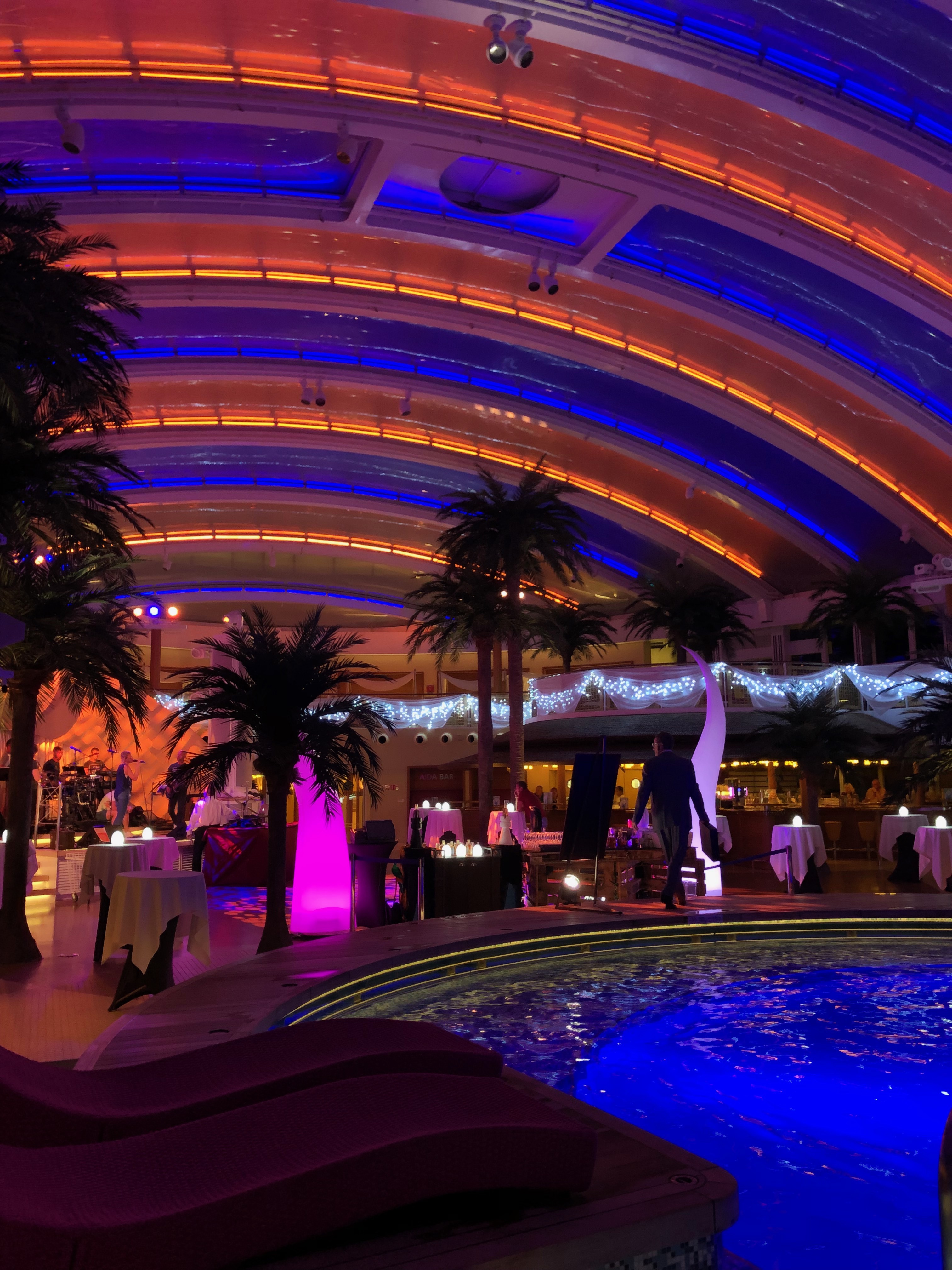 Wir genießen unser Abendessen, schlendernd anschließend eine Runde über die Decks von AIDAperla, stoppen kurz im Theatrium und finden uns anschließend an der AIDAbar im Beachclub wieder, der schon für die anstehende Party dekoriert ist.