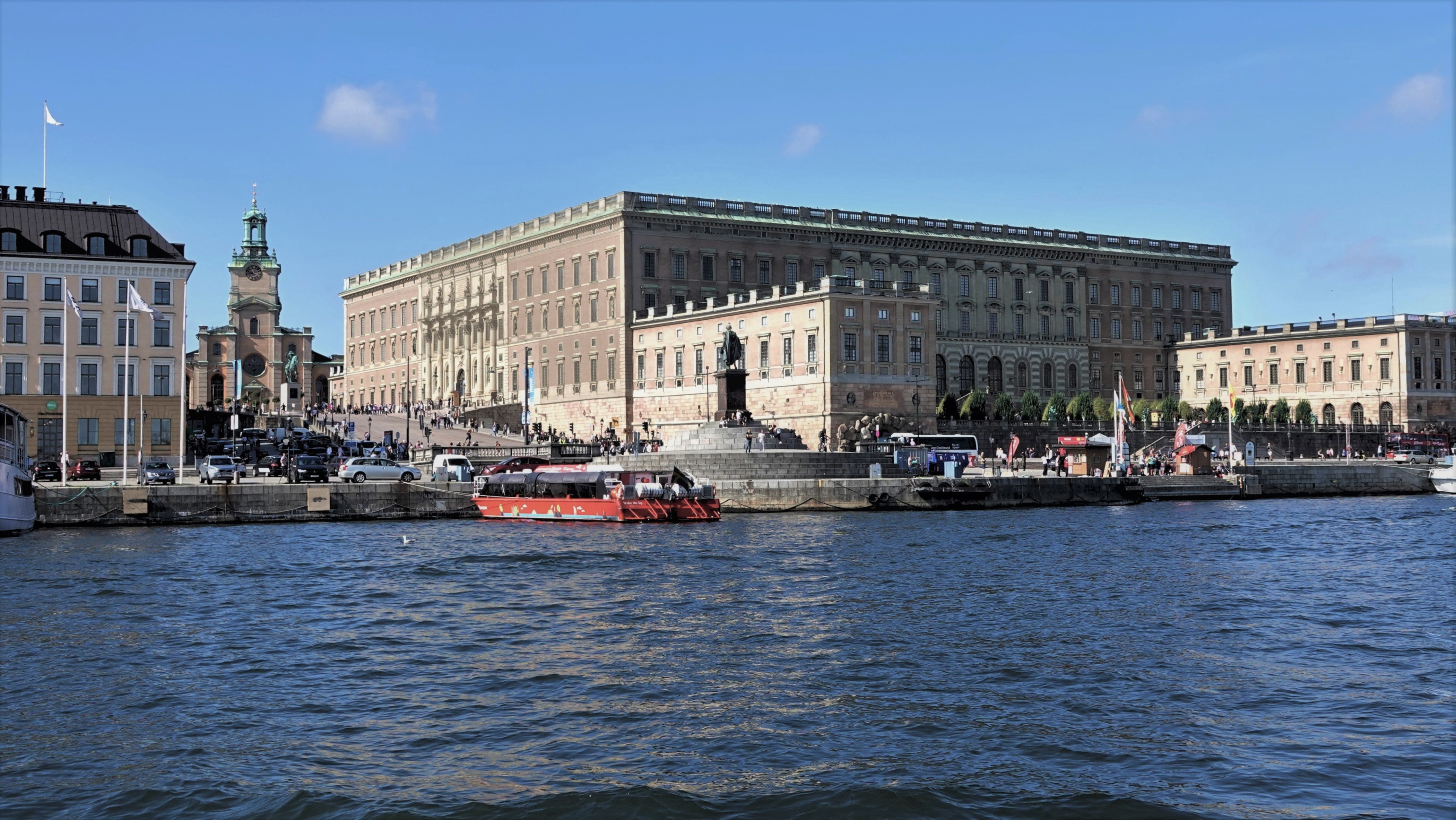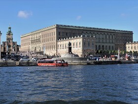 Nur durch den Schlossplatz „Slottsbaken“ von der Altstadt getrennt, schippern wir dann am königlichen Stadtschloss „Kungliga Slottet“ mit dem schönen Dom „Storkyrkan“ vorbei. Nachdem 1697 das ursprüngliche Schloss „Tre Kronor“ fast gänzlich abgebrannt war, dauerte es trotz eines zügigen Wiederaufbaus im italienischen Barockstil bis zur Fertigstellung und zum Einzug der königlichen Familie bis 1754. Direkt neben dem Schloss steht der Stockholmer Dom, in dem zahlreiche Könige gekrönt wurden. Auch fanden hier viele blaublütige Hochzeiten statt.