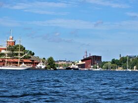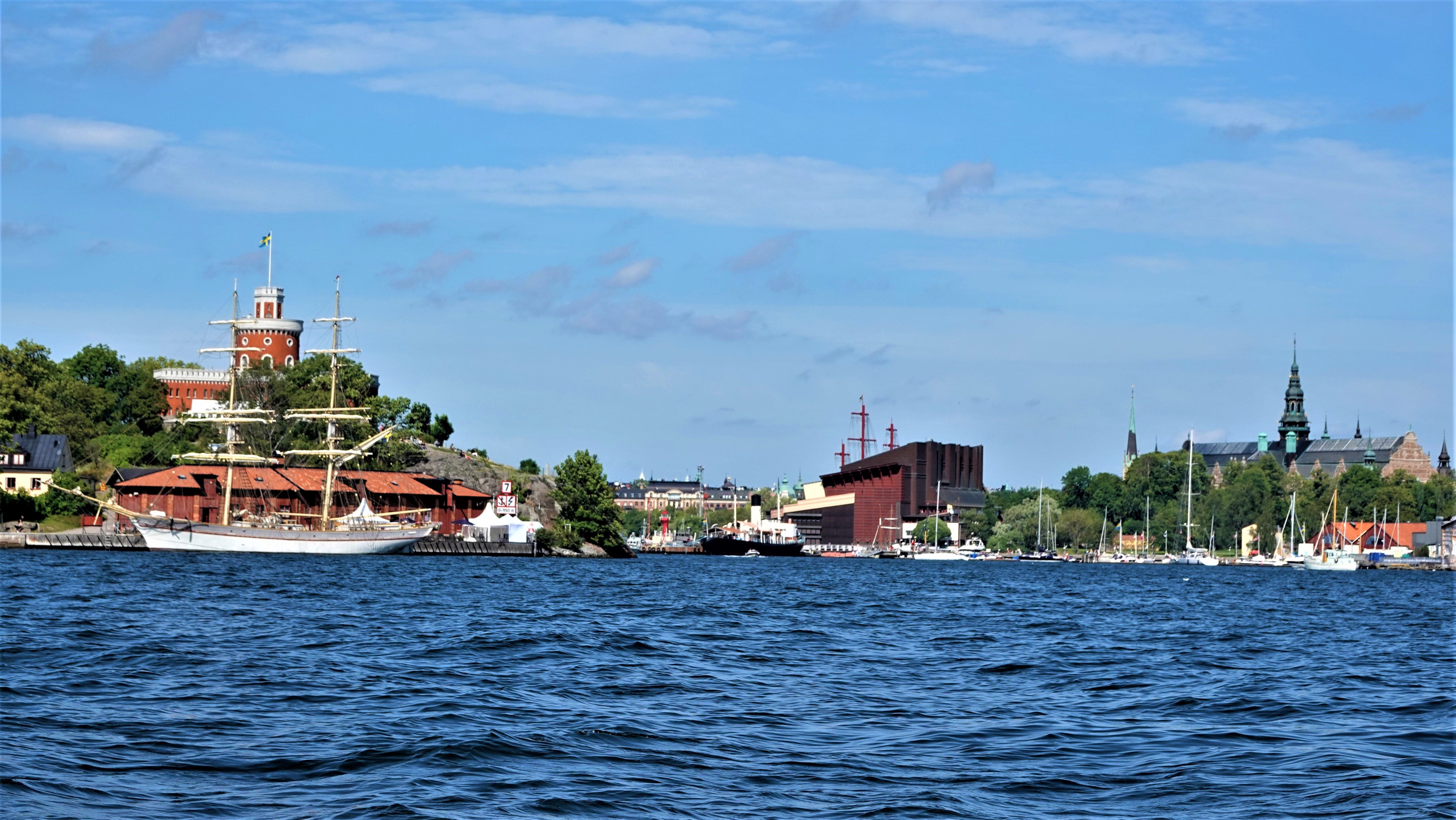 Wieder abgelegt geht die Fahrt nun in Richtung Vasa-Museum. Eigentlich wollen wir ins Museum, aber bei diesem schönen Wetter geht das für uns nicht. So müssen die Informationen aus dem Reiseführer reichen. Hier eine Kurzform: Die „Vasa“ sollte während des 30-jährigen Krieges allein durch seine Präsenz den Gegner in Angst und Schrecken versetzen. So hatte Gustav Adolf II. der „Vasa“ ein zweites Kanonendeck verordnet. Dadurch wanderte der Schwerpunkt nach oben und die Stabilität ging infolgedessen verloren. Sie wurde auch nicht durch zusätzlichen Ballast wiederhergestellt. So reichte während der Jungfernfahrt eine leichte Brise, das Schiff kränkte stark, Wasser drang durch die geöffneten Kanonenpforten ins Schiff und die „Vasa“ sank innerhalb weniger Minuten. 1956 wurde das Wrack im Stockholmer Hafenschlick lokalisiert. Die komplizierte Hebung dauerte dann noch einmal fünf Jahre, bis die „Vasa“ am 24.04.1961 wieder an die Oberfläche kam. In der Vasa-Werft, einem ersten provisorischen Museum wurde das Schiff 17 Jahre lang kontinuierlich mit einem chemischen Konservierungsmittel besprüht. Im Jahr 1988 ging die „Vasa“ wohl auf ihre letzte Reise in das neu erbaute „Vasamuseet“ auf der Insel Djurgården, das im Sommer 1990 von König Karl Gustav XVI. persönlich eröffnet wurde.