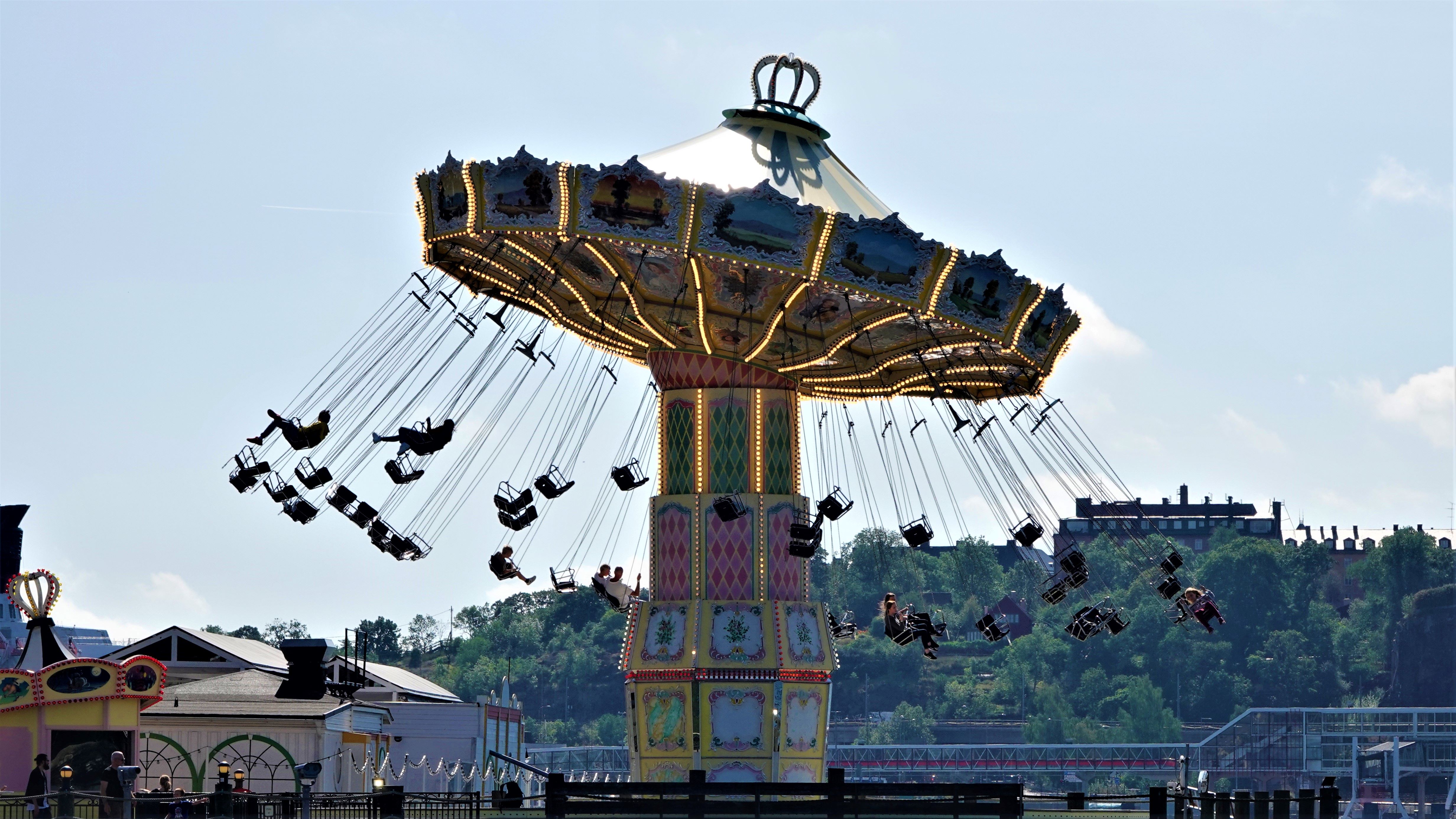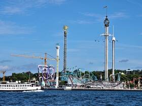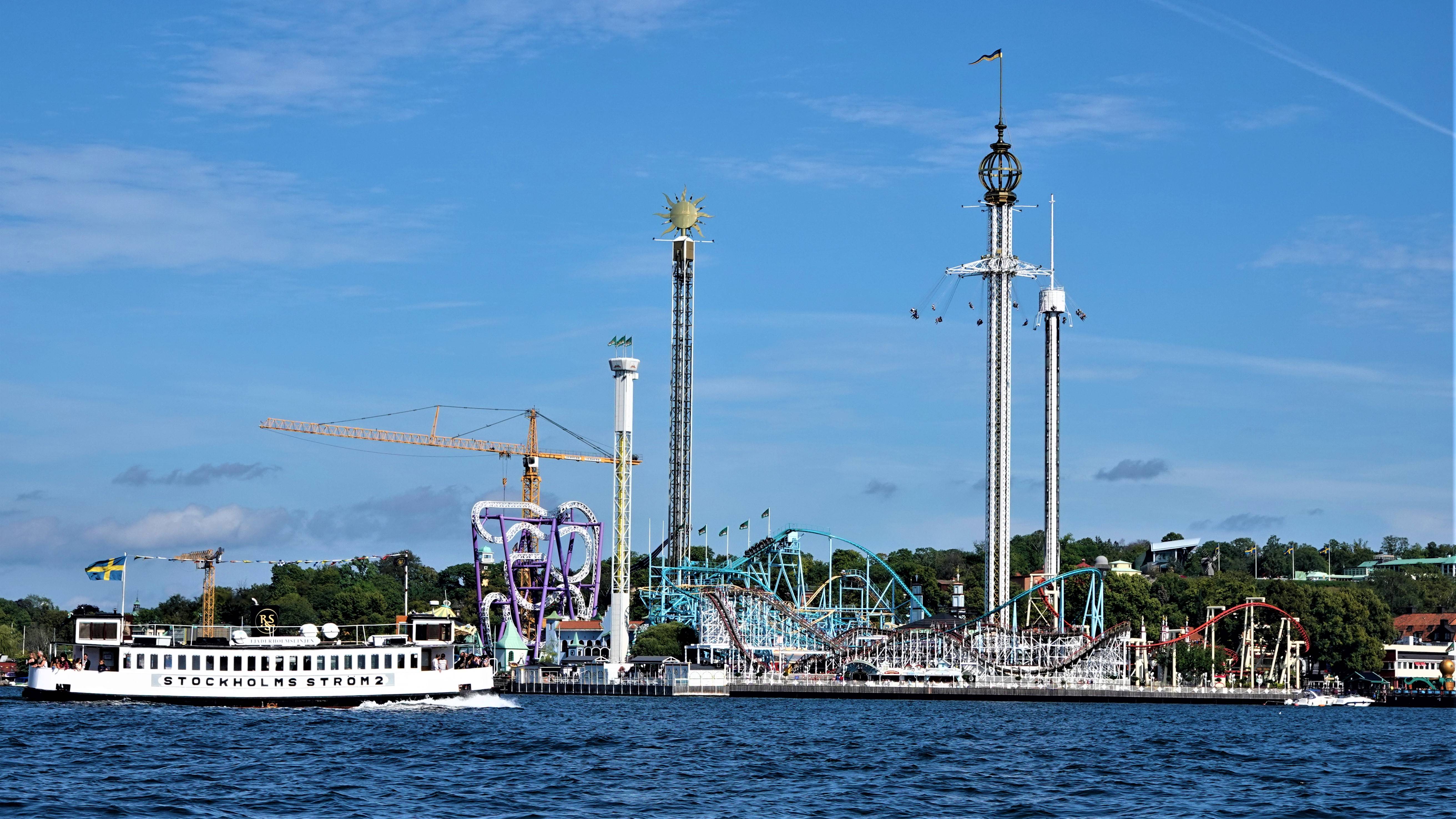 So langsam orientieren wir uns wieder in Richtung unseres Hopp on Hopp off Bootes. Dafür durchqueren wir Gröna Lund, einen klassischen Freizeipark. Obwohl Skansen ein sehr gut besuchter Ort ist, so ist es dort dennoch ruhig gewesen. Das soll sich hier komplett ändern. Schon von Weitem hören wir das Geschrei und das Gequieke mutiger und nicht so mutiger Achterbahnfahrer.