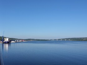 Unten am Hafen angekommen, haben wir Sicht auf die „Sundsvallsbron“, das auffälligste Bauwerk der Gegend. Mit 2.109 Metern Länge überspannt sie den Sundsvallsfjärden und ist Schwedens drittlängste Brücke. Was wir auch noch sehen: der Nebel hat sich noch immer nicht verzogen.