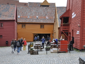 Wir laufen zuerst durch die Fußgängerzone, dann etwas abseits durch kleine Straßen zurück Richtung Bryggen, dem ältesten Stadtteil Bergens. Irgendwie kommt mir die Stadt dieses Mal sehr schmutzig vor. Besonders wenn man die Touristenpfade verlässt, liegt auffällig viel Müll an den Straßen und viele Häuser wirken vernachlässigt und stark renovierungsbedürftig.