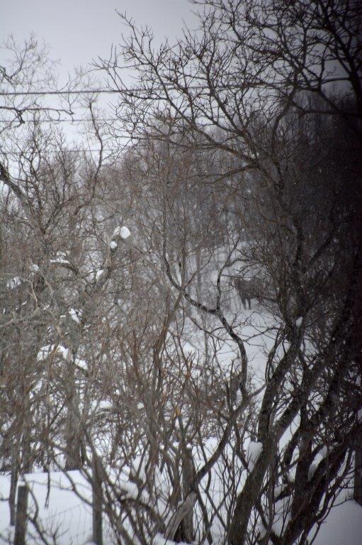 Nun aber hinein in den guten Wagen. So richtig schnell fuhr Edeltraut nicht, denn der Schneefall wurde immer stärker. Trotzdem hatte sie Zeit für eine weitere Überraschung, denn nachdem sie von uns gehört hatte, dass wir noch nie Elche in natura gesehen hatten, schlug sie einen kleinen Abstecher in eine Gegend vor, in der sich normalerweise Elche aufhielten. Niemand von uns widersprach und so fuhr sie abseits der Hauptverkehrsstraße fast im Schritttempo und hielt nach den Kolossen Ausschau. Und was erblickten wir? Rentiere, die im Schnee ein Nickerchen machten. Keine Elche … Am Ende der Sackgasse wendete Edeltraut den Wagen und sie spähte während der Rückfahrt weiter nach den Tieren. Und sie erblickte sie – allerdings weiter weg von der Straße in einem Wäldchen …