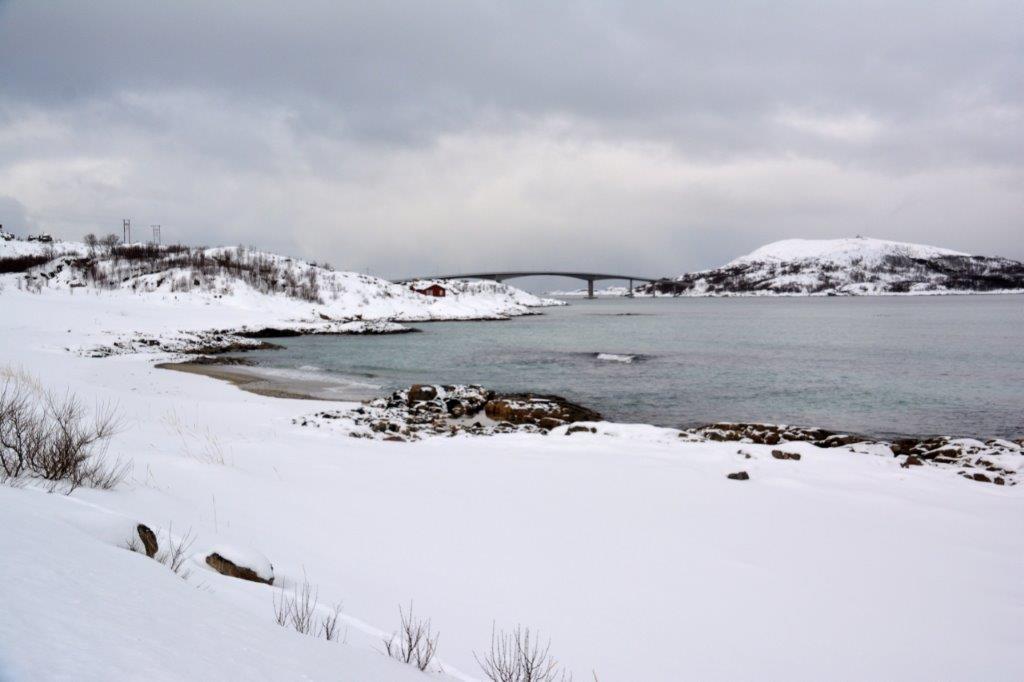 die Brücke, die die Insel Kvalyøa mit unserem Hauptziel, die Insel Hillesøya mit dem Dorf Sommarøy verband. Bevor wir weiterfuhren, gönnten wir uns einen Blick zurück: