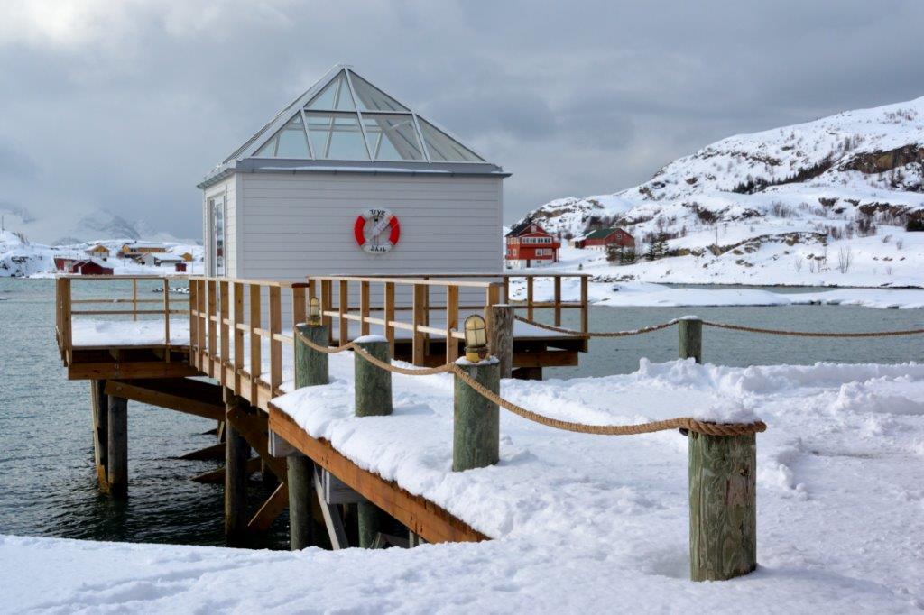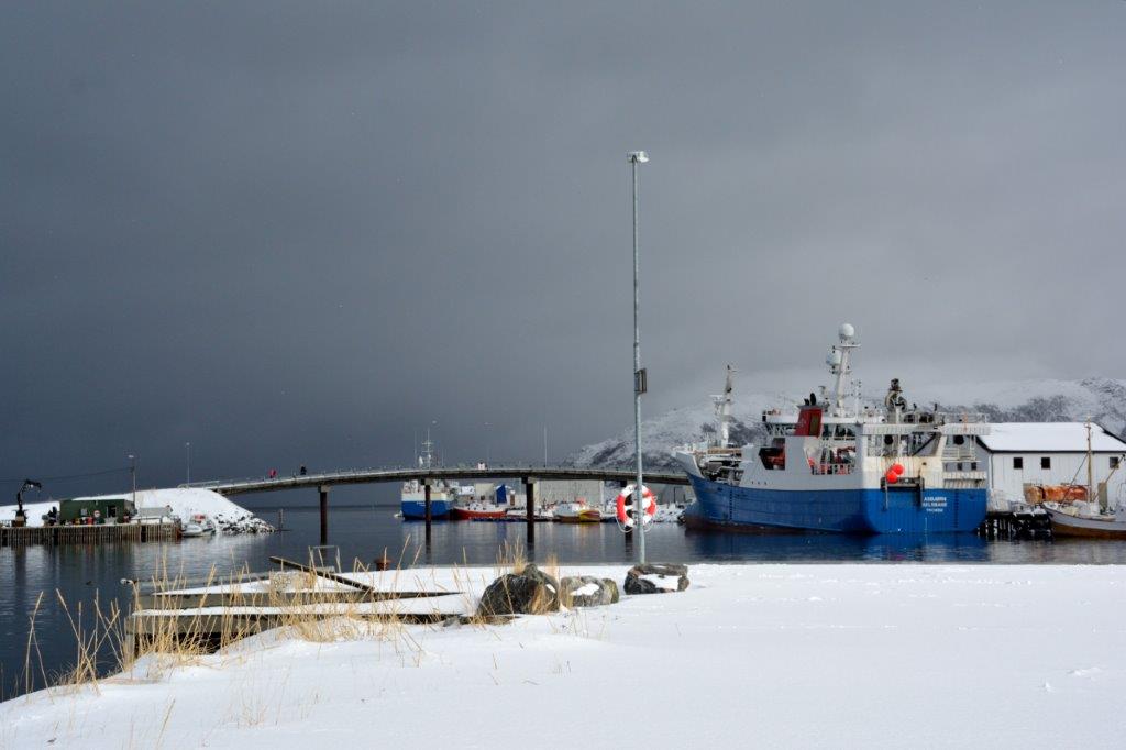 Das sollte ein Tag werden! Die Straßen waren überwiegend weiß. Weißer Asphalt? Nee … Und der Schnee fiel weiter mit aller Macht. Links und rechts sahen wir so gut wie nichts. Erst als wir in Kaldfjord am Ende des gleichnamigen Fjords unsere erste Pause machten, erkannten wir nicht nur Konturen. Der Schneefall hatte etwas nachgelassen … Kaldfjord ist mit weniger als 1.000 Einwohnern ein Miniort. Er war ziemlich schnell zu erkunden. Einige Häuser im Skandinavienlook – also blutrot (soweit man es erkennen konnte …). Eine Bucht mit Sandstrand? Ein Schiffsanleger mit unschuldig weißen Booten. Schneeberge. Gerade noch zu erkennen waren die Ergebnisse eines großen Norwegerhobbys. Stockfische oder Fisch, die einmal stocksteif werden sollten. Eine gute Leidenschaft. Einmal aufhängen und dann baumeln lassen … Immer an der kalten, frischen Nordlandluft …