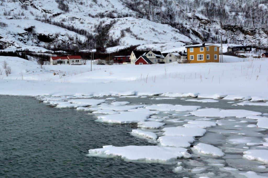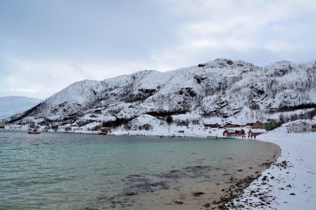 Schon wieder Einsamkeit pur. Wenige Häuser, eine Bootsanlegestelle. Auf der anderen Seite der Bucht fast greifbar die nächste Häuseransammlung. Ferienhäuser oder ganzjährig bewohnte Anwesen? Wir konnten es nicht erkennen und wissen es auch nicht. Egal, das, was wir rechts von uns sahen, war für uns Flachländer nicht alltäglich. Wir folgten weiter dem Sørfjorden und erreichten die nächste Häuseransammlung. Hinter Andersvika verließ Edeltraut die Hauptstraße und hielt inmitten einer Ansiedlung. Hier war so gut wie nichts los. Einige Kinder fuhren auf Schlitten die Hügel hinab; deren Schnee schaufelnde Eltern waren die einzigen Erwachsenen, die wir sahen. Wir, die Busbesatzung von neun Personen, sorgten für Übervölkerung. Aber die Gegend … der Strand, der sich von der Schneelandschaft abgrenzte …