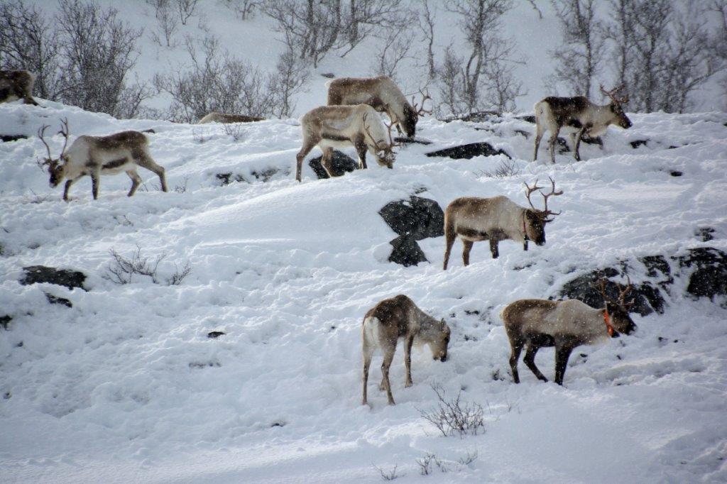 Auch wenn es noch immer leicht schneite – wir mussten die Rentierherde bewundern. Die lieben Tiere – allerdings ohne rote Nasen – warum? - waren so freundlich, in der Nähe eines Parkplatz zu grasen.