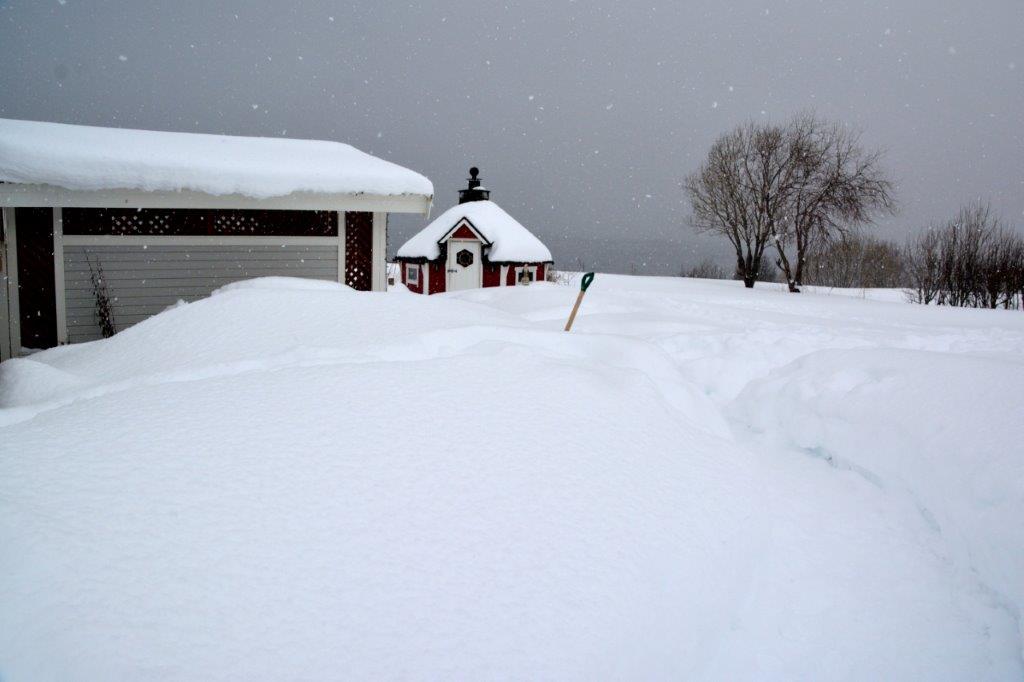 Aber über dem Nordmeer sah es nicht sehr friedvoll aus – es braute sich etwas zusammen … auch über dem Inselinneren zeigten sich mehr dicke Wolken als der von uns bevorzugte blaue Himmel … Edeltraut wies uns kurz ein und empfahl einen Spaziergang entlang des Strandes zum Arctic Hotel. Logisch, dass wir uns sofort auf den Weg machten und durch den hohen Schnee stiefelten.