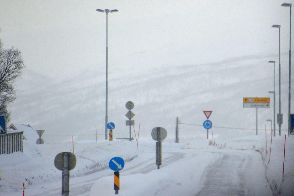 Vor unserer AIDAcara wartete Edeltraut mit ihrem Kleinbus auf uns. Dieses Mal waren wir ohne Floppys unterwegs, die ihre Kreuzfahrt später als wir gebucht hatten und keine freien Plätze bei Edeltraut erhalten hatten, dafür bei Karina, die eine ähnliche Rundfahrt vorhatte. Edeltraut stellte sich kurz vor und fuhr uns quer durch Tromsøya, die Hauptinsel Tromsøs. Nachdem wir über die Sandnessundbrücke gefahren waren, wurde es dunkler. Keine Angst, kein Unwetter. Nur Schnee – aber davon kam jede Menge von oben. Als wir nach kurzer Zeit einen der Vororte Tromsøs, Kvaløsletta, erreichten, konnten wir ein Foto aus dem Autofenster wagen.
