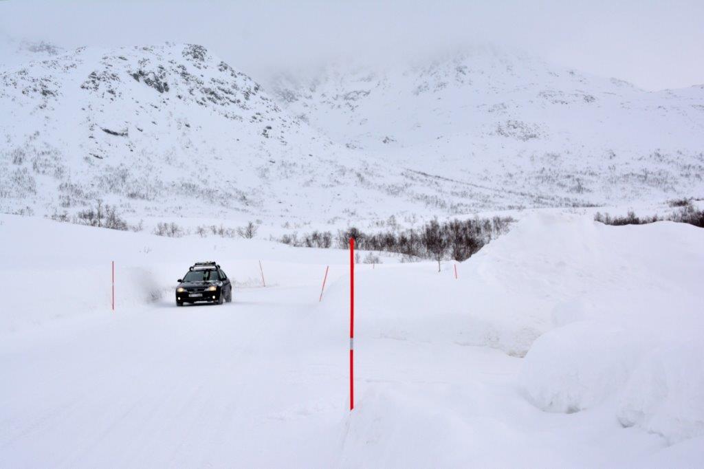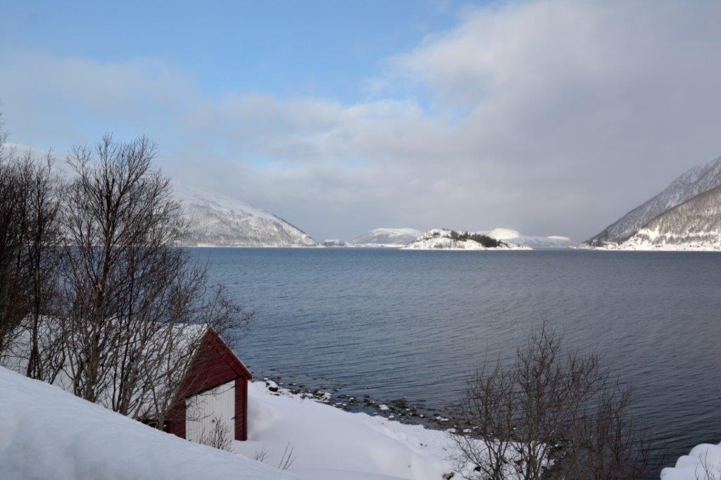 Alles weiß – wir konnten uns vorstellen, dass in den vergangenen Wochen noch viel mehr Schnee zu verzeichnen war. Edeltraut und wir konnten den Straßenverlauf sehr gut erkennen. Bei starkem Schneefall halfen die roten Begrenzungsstangen. Wir benötigten sie nicht und verließen nach einiger Zeit das langgestreckte, lawinengefährdete Tal. Der Sørfjorden lag vor uns und er begleitete uns eine Zeitlang. In der Nähe der Häuseransammlung beim Gehöft Kroken vertraten wir uns nochmals die Beine.