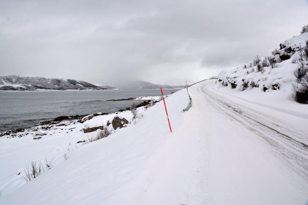 Alles weiß – wir konnten uns vorstellen, dass in den vergangenen Wochen noch viel mehr Schnee zu verzeichnen war. Edeltraut und wir konnten den Straßenverlauf sehr gut erkennen. Bei starkem Schneefall halfen die roten Begrenzungsstangen. Wir benötigten sie nicht und verließen nach einiger Zeit das langgestreckte, lawinengefährdete Tal. Der Sørfjorden lag vor uns und er begleitete uns eine Zeitlang. In der Nähe der Häuseransammlung beim Gehöft Kroken vertraten wir uns nochmals die Beine.