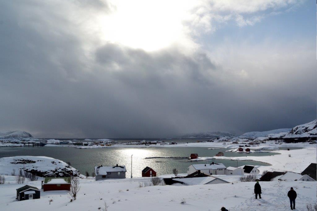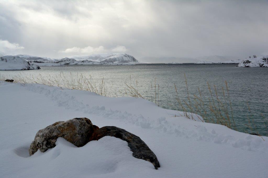 Aber über dem Nordmeer sah es nicht sehr friedvoll aus – es braute sich etwas zusammen … auch über dem Inselinneren zeigten sich mehr dicke Wolken als der von uns bevorzugte blaue Himmel … Edeltraut wies uns kurz ein und empfahl einen Spaziergang entlang des Strandes zum Arctic Hotel. Logisch, dass wir uns sofort auf den Weg machten und durch den hohen Schnee stiefelten.