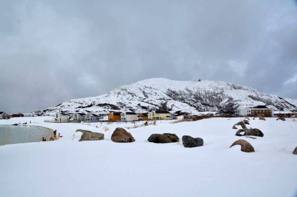 Schon wieder Einsamkeit pur. Wenige Häuser, eine Bootsanlegestelle. Auf der anderen Seite der Bucht fast greifbar die nächste Häuseransammlung. Ferienhäuser oder ganzjährig bewohnte Anwesen? Wir konnten es nicht erkennen und wissen es auch nicht. Egal, das, was wir rechts von uns sahen, war für uns Flachländer nicht alltäglich. Wir folgten weiter dem Sørfjorden und erreichten die nächste Häuseransammlung. Hinter Andersvika verließ Edeltraut die Hauptstraße und hielt inmitten einer Ansiedlung. Hier war so gut wie nichts los. Einige Kinder fuhren auf Schlitten die Hügel hinab; deren Schnee schaufelnde Eltern waren die einzigen Erwachsenen, die wir sahen. Wir, die Busbesatzung von neun Personen, sorgten für Übervölkerung. Aber die Gegend … der Strand, der sich von der Schneelandschaft abgrenzte …