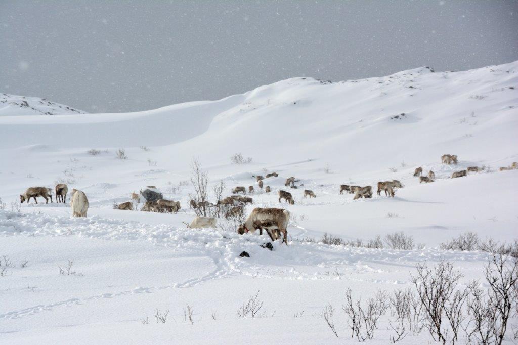 Auch wenn es noch immer leicht schneite – wir mussten die Rentierherde bewundern. Die lieben Tiere – allerdings ohne rote Nasen – warum? - waren so freundlich, in der Nähe eines Parkplatz zu grasen.
