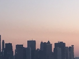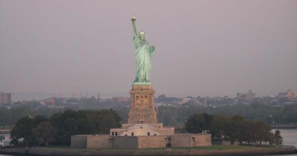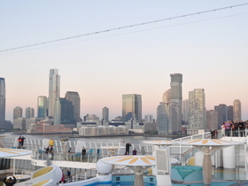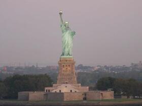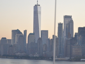 Die Skyline von New York im Morgengrauen, die Freiheitsstatue an der Backbordseite ( mein Gott ist die klein ) und Lower Manhatten steuerbord.