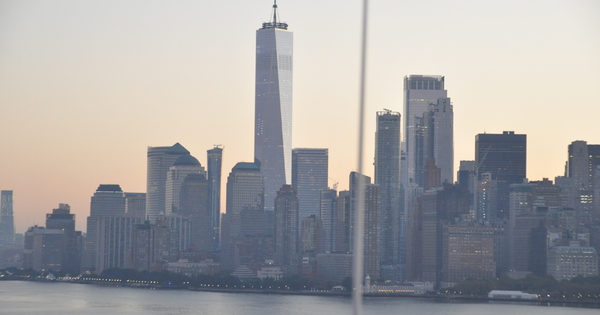 Die Skyline von New York im Morgengrauen, die Freiheitsstatue an der Backbordseite ( mein Gott ist die klein ) und Lower Manhatten steuerbord.