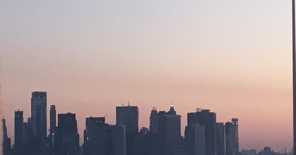 Die Skyline von New York im Morgengrauen, die Freiheitsstatue an der Backbordseite ( mein Gott ist die klein ) und Lower Manhatten steuerbord.