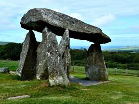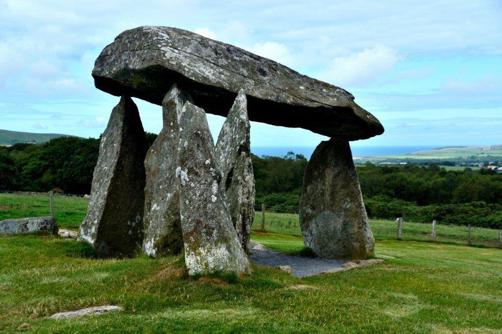 Die Steinboliden waren aus demselben Stein wie die von Stonehenge geschlagen. Nur an diesem Flecken hatte man es einfacher – die Steinblöcke stammten aus dieser Gegend und mussten nicht über hunderte von Kilometern transportiert werden. Die ersten Steinkreise von Stonehenge wurden übrigens knapp 1.000 Jahre später als das Hünengrab von Pentre Ifan gebildet. In diesem Portal Tomb wurden Tote gemeinschaftlich bestattet; bis auf den Eingangsbereich mit den drei stehenden Steinen war die Bestattungsanlage mit Erde bedeckt; wahrscheinlich wurde in den Hügel hinein gegraben. Ápropos Hügel – die Lage war einzigartig mit einem tollen Ausblick auf Meer und Land. Aber ob die Toten etwas davon hatten?