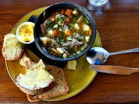 Schon wieder die Erinnerungen an Irland, speziell an die Dingle-Halbinsel, wurden wach. Und dann unser Lunch. Ganz einfach – ein walisisches Nationalgericht: Gemüsesuppe mit mürbe gekochten, aber nicht verkochten Lammrückenstreifen. Ein Stückchen Schnittkäse wurde in die Suppe gebröckelt. Dazu gab es dicke Scheiben frisch gebackenen Brotes mit gesalzener Butter.
