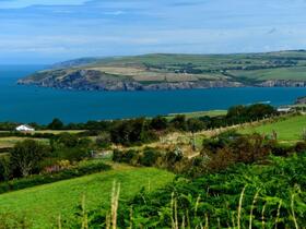 Ich war dabei. Ganz oben. In der Hand … na, Ihr wisst schon. Kein Regen mehr, bedeckt mit Hoffnungsschimmer, ca. 19°. Der Anker wurde geworfen und die Tenderboote zu Wasser gelassen. Unseren Anker warfen wir im Restaurant, um direkt nach dem Frühstück per Tender an Land gebracht zu werden. Was hatten wir an diesem Tage vor? Nichts Bestimmtes. Entweder per Bus in die Kleinstadt St. Davis fahren oder ganz einfach Richtung Fishguard und über walisische Hügel zu wandern. Aber wie schon so oft kam alles anders. Nur nebenbei lauschten wir der glockenreinen Stimme einer Waliserin. Ein Volkslied in ihrer alten Sprache. Unser Hauptaugenmerk war auf Plakate gerichtet, die einen Ausflug zu schönen und interessanten Zielen in North Pembrokeshire offerierten. Vier Stunden im Kleinbus – und der Preis stimmte. Wir entschieden uns schnell und saßen nach einigen Minuten mit vier anderen Ausflüglern in einem VW-Bus. Und los – zunächst durch das kleine, gemütliche Fishguard mit seinem pittoresken Fischerhafen, dann über Nebenstrecken hügelauf- und -abwärts. Die Landschaft gefiel uns außerordentlich. Sie erinnerte mit ihren durch Hecken und Trockensteinmauern eingefriedeten Weiden an Irland. Auch die Straßen. Eng und mitunter begrenzt mit rechtwinkelig nach oben gehenden Mauern oder Hecken. So eng, dass bisweilen keine zwei Autos nebeneinander passten. Natürlich mit Ausweichstellen. Ab und zu mit Grasnarben in der Mitte – die walisische Autobahn … Natürlich wies unser Guide auf Eigentümlichkeiten und interessante Dinge hin. Auf gut zu verstehendem Englisch; zumindest Grundkenntnisse waren von Vorteil. Gut war, dass kein permanenter Rededurchfall auf uns herabprasselte. So konnten wir uns primär auf die Umgebung konzentrieren.