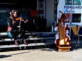 Am Hafen wurden wir von je einer Violinen- und Harfenspielerin empfangen.