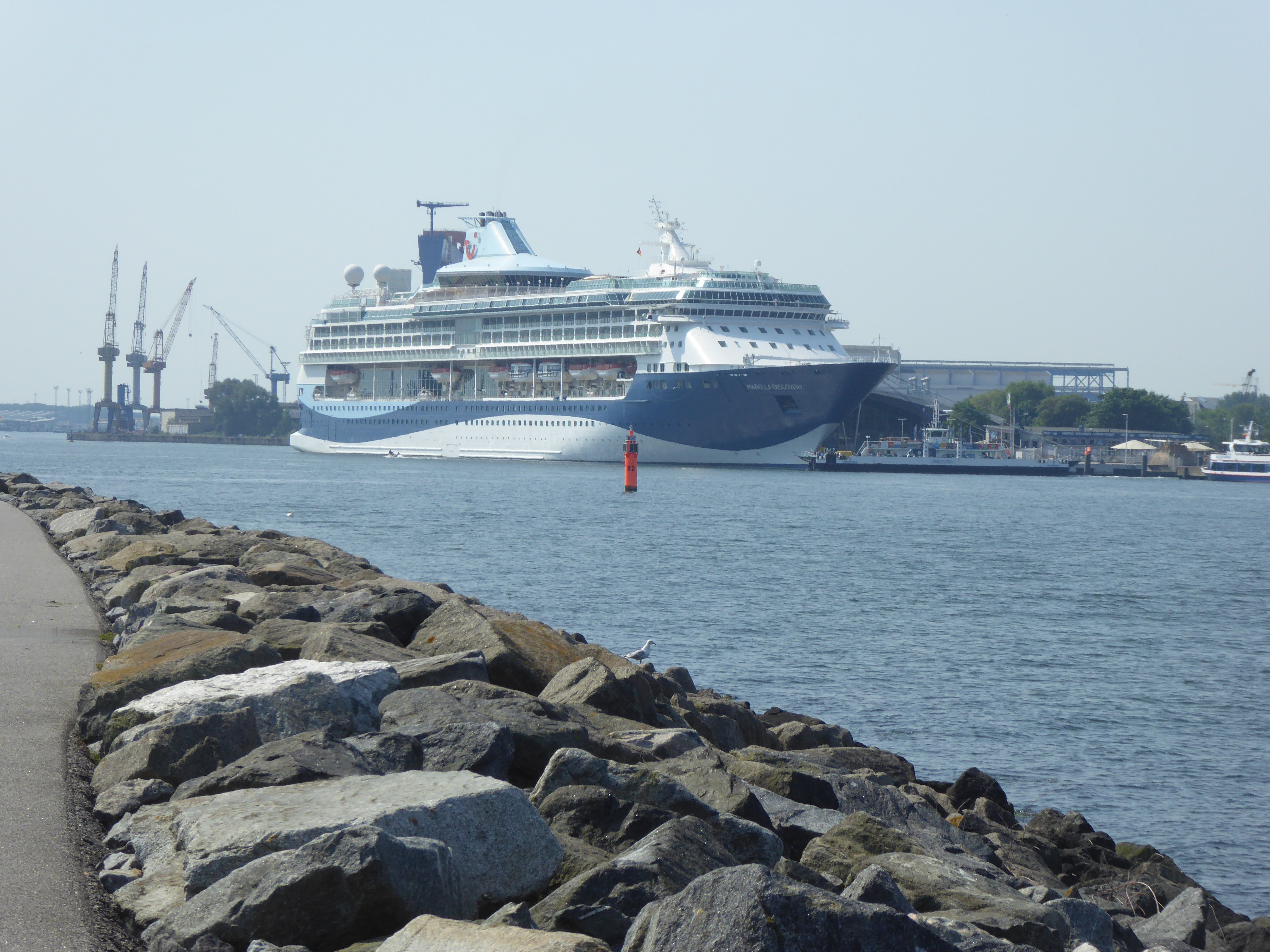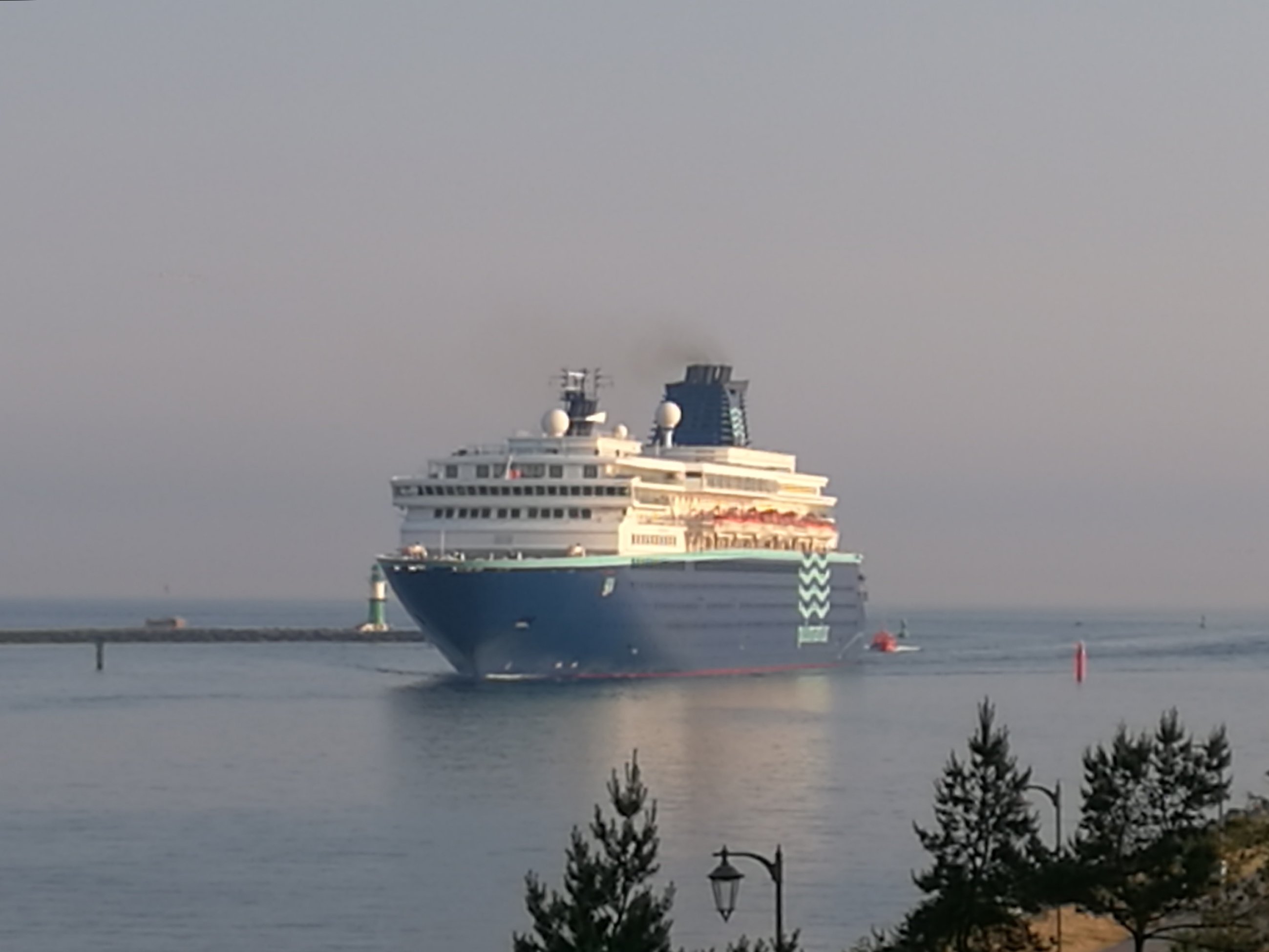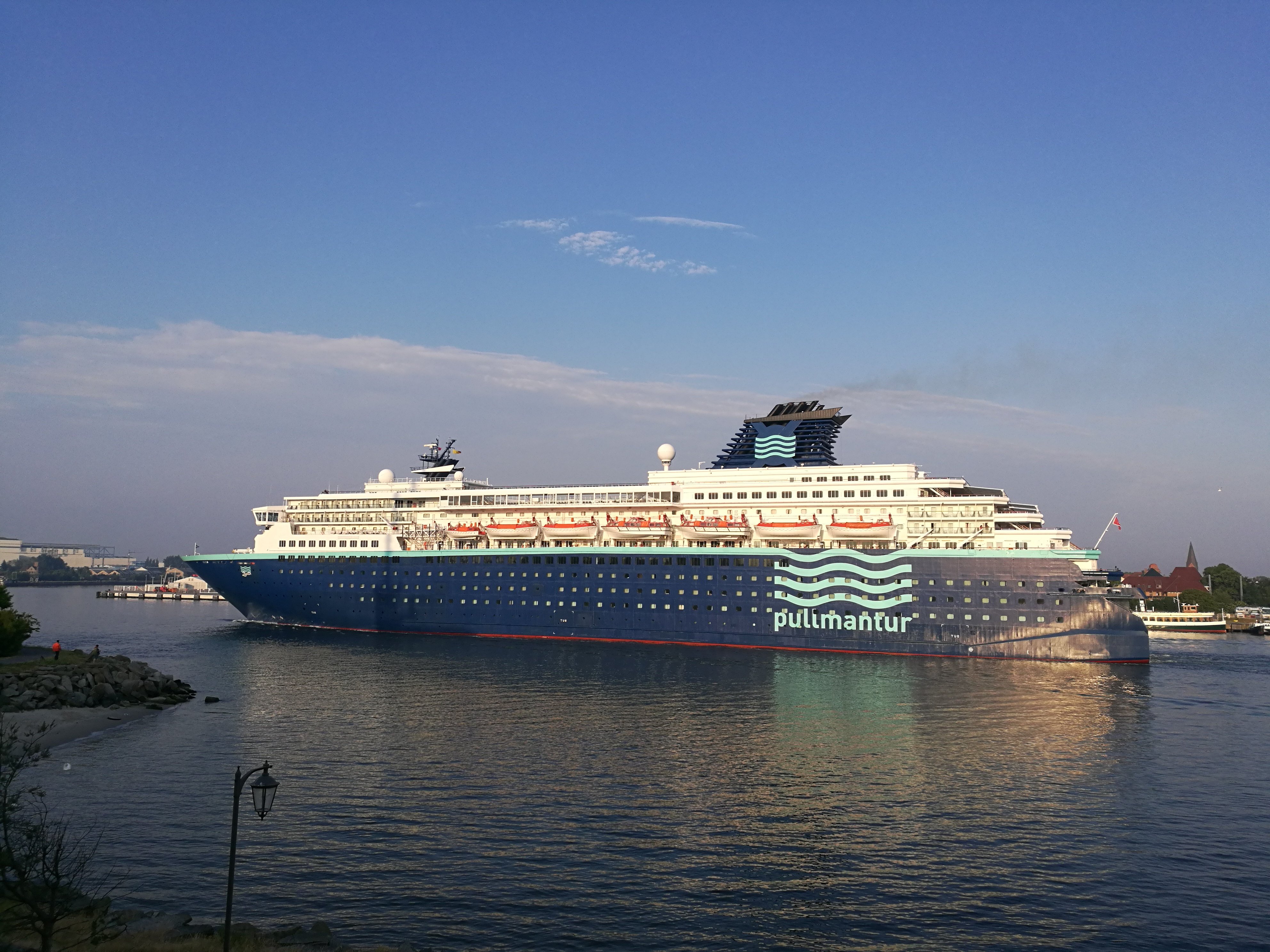Ein weiterer Gast in Warnemünde: die Zenith von Pullmantour. Hier läuft sie von der Morgensonne perfekt in Szene gesetzt in den Hafen ein.