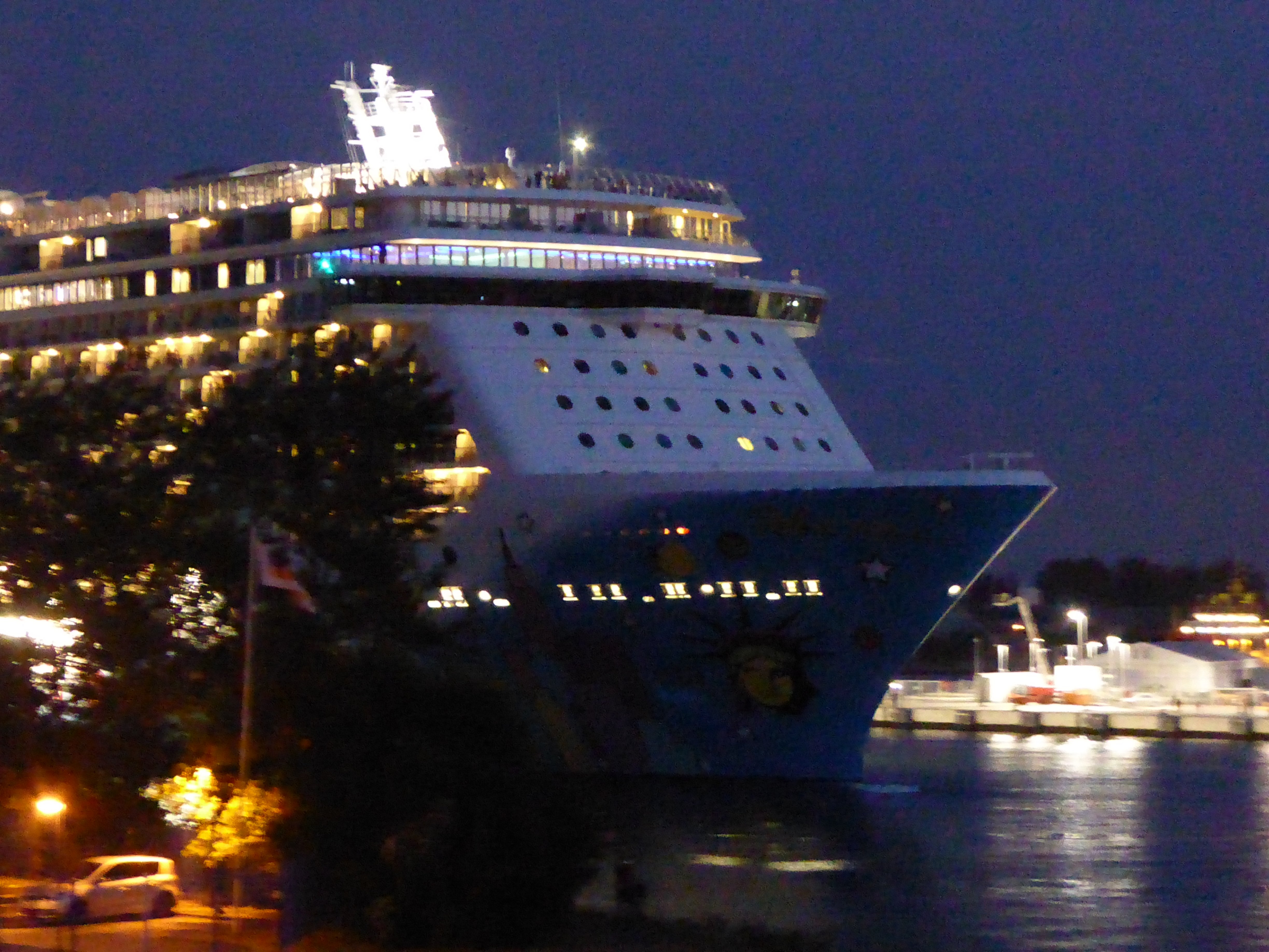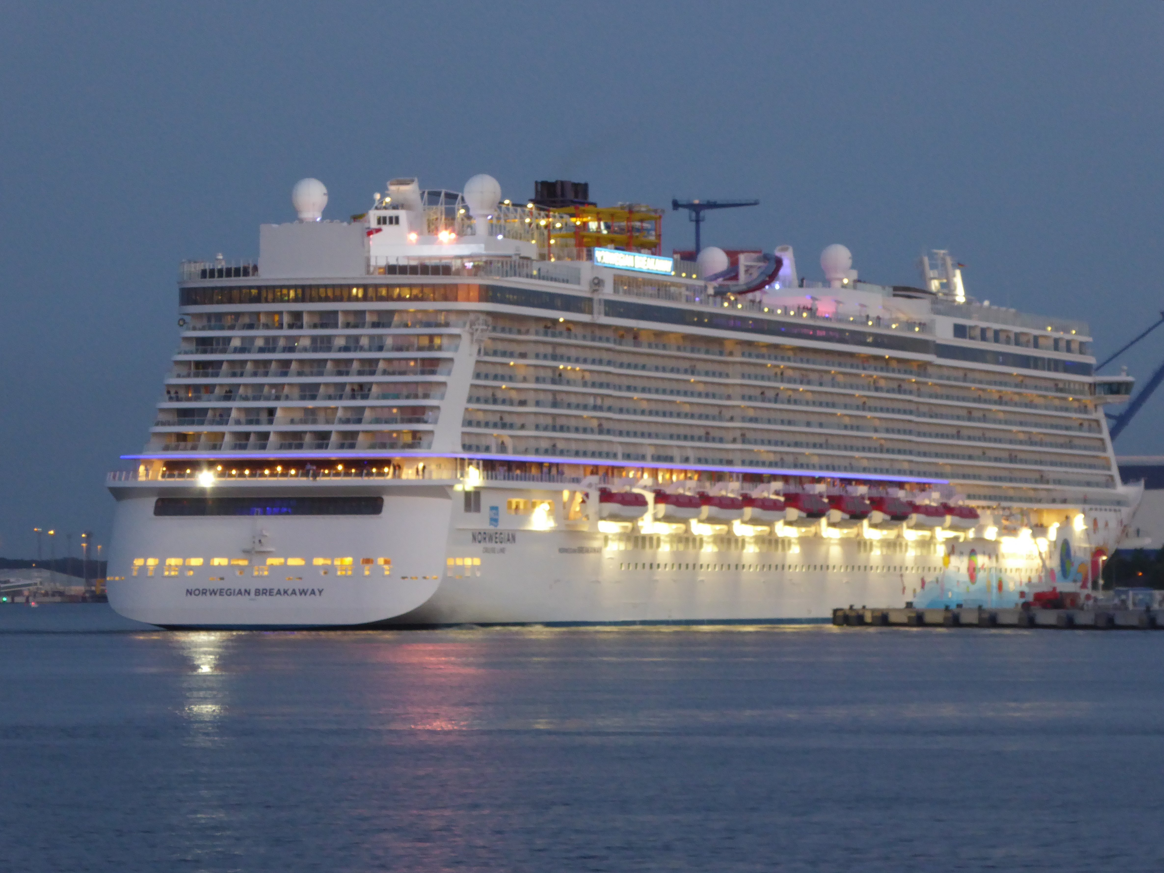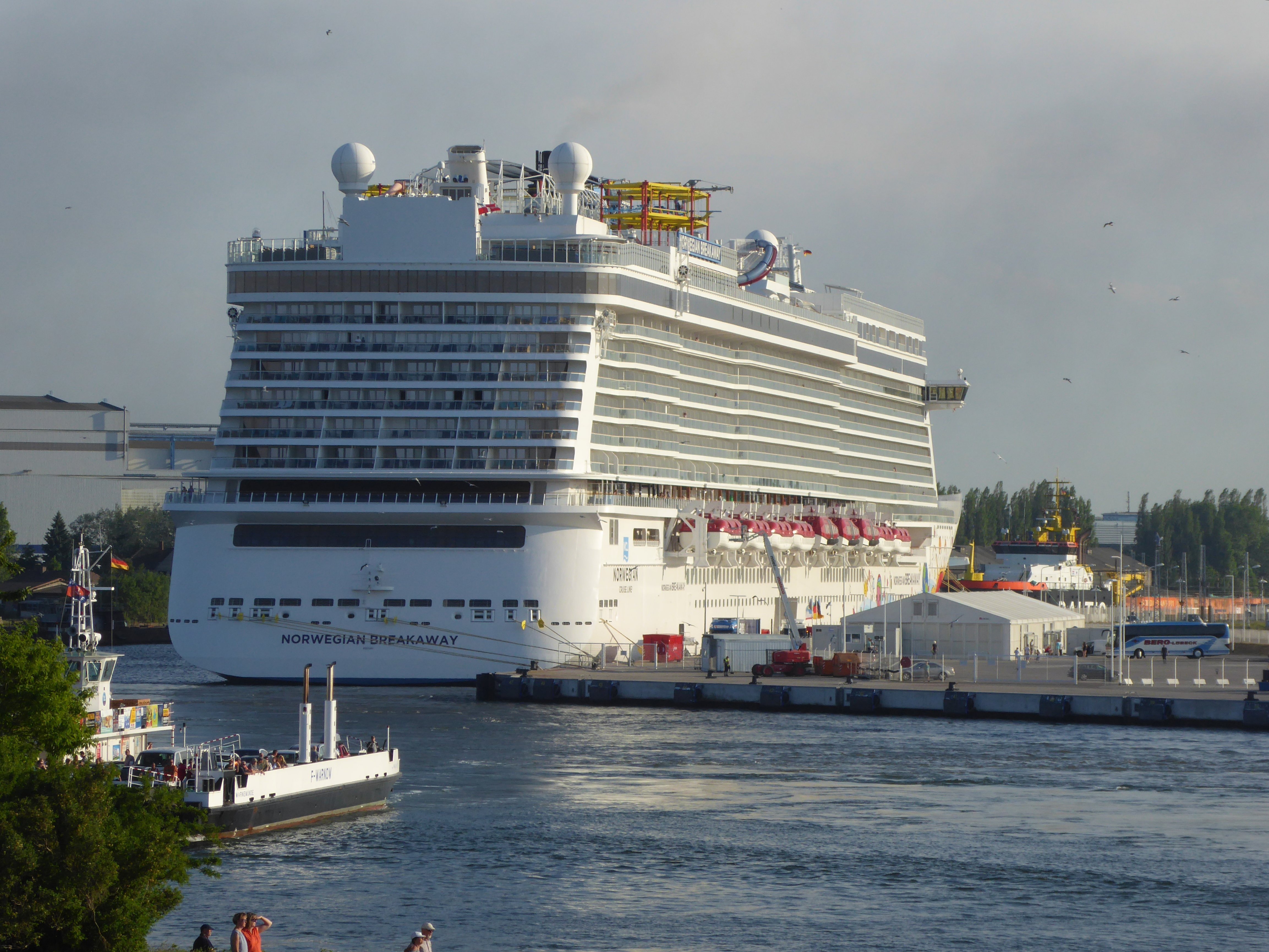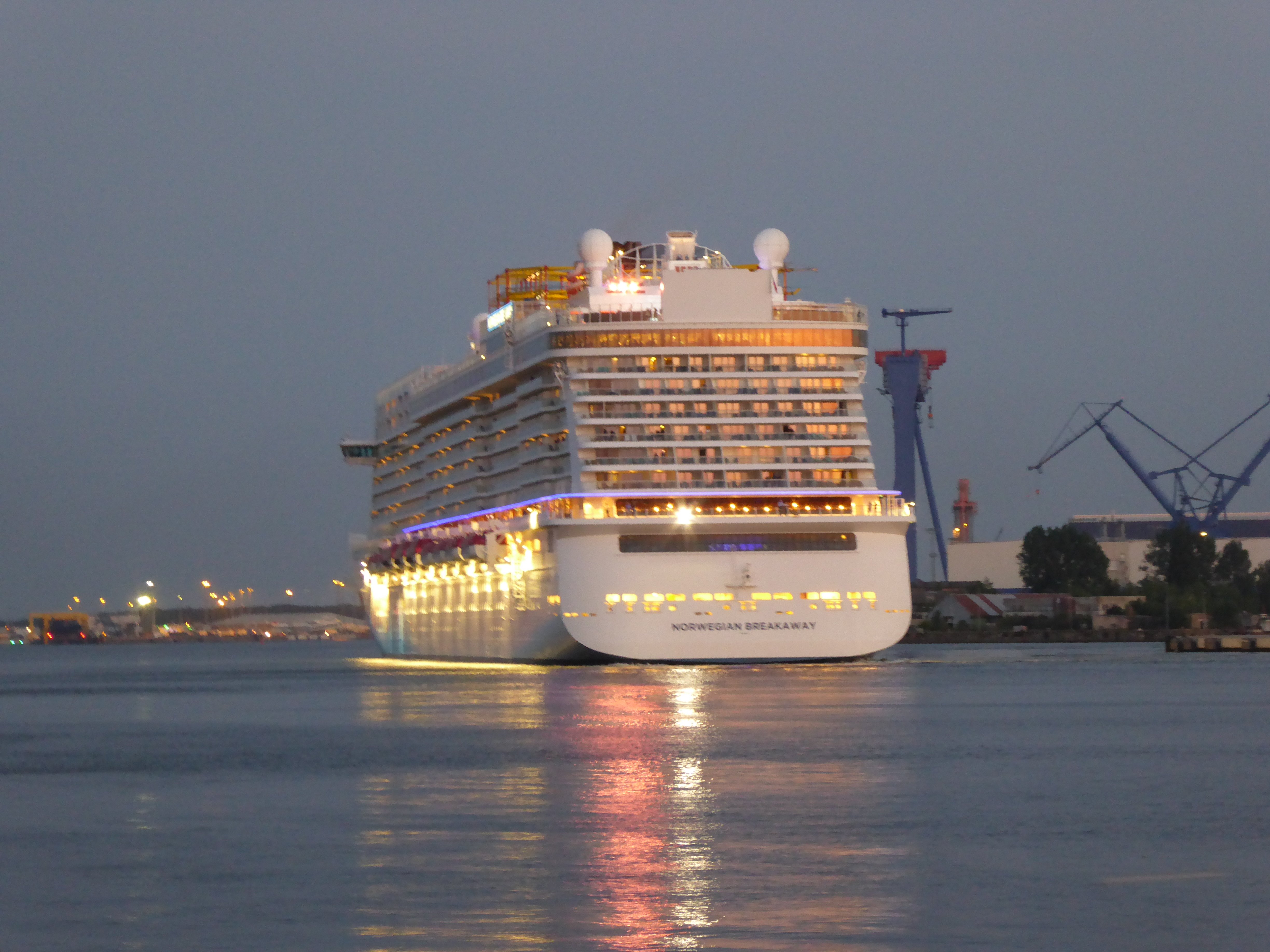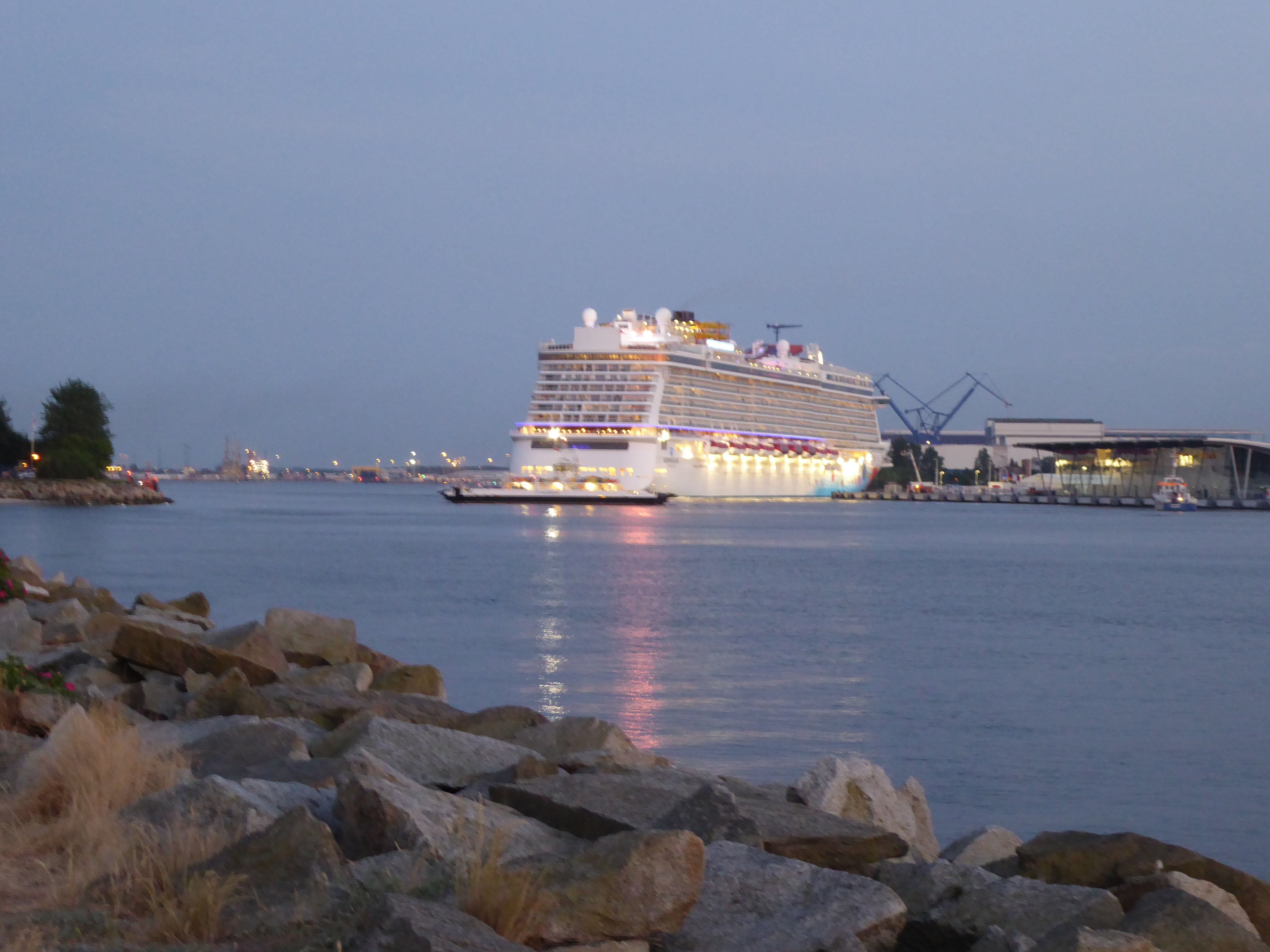 Begleitet von einem deutschen Volkslied verlässt die Orchestra den Hafen und gibt den Blick auf die NCL Breakaway frei, die den Tag am LP8 verbracht hat.