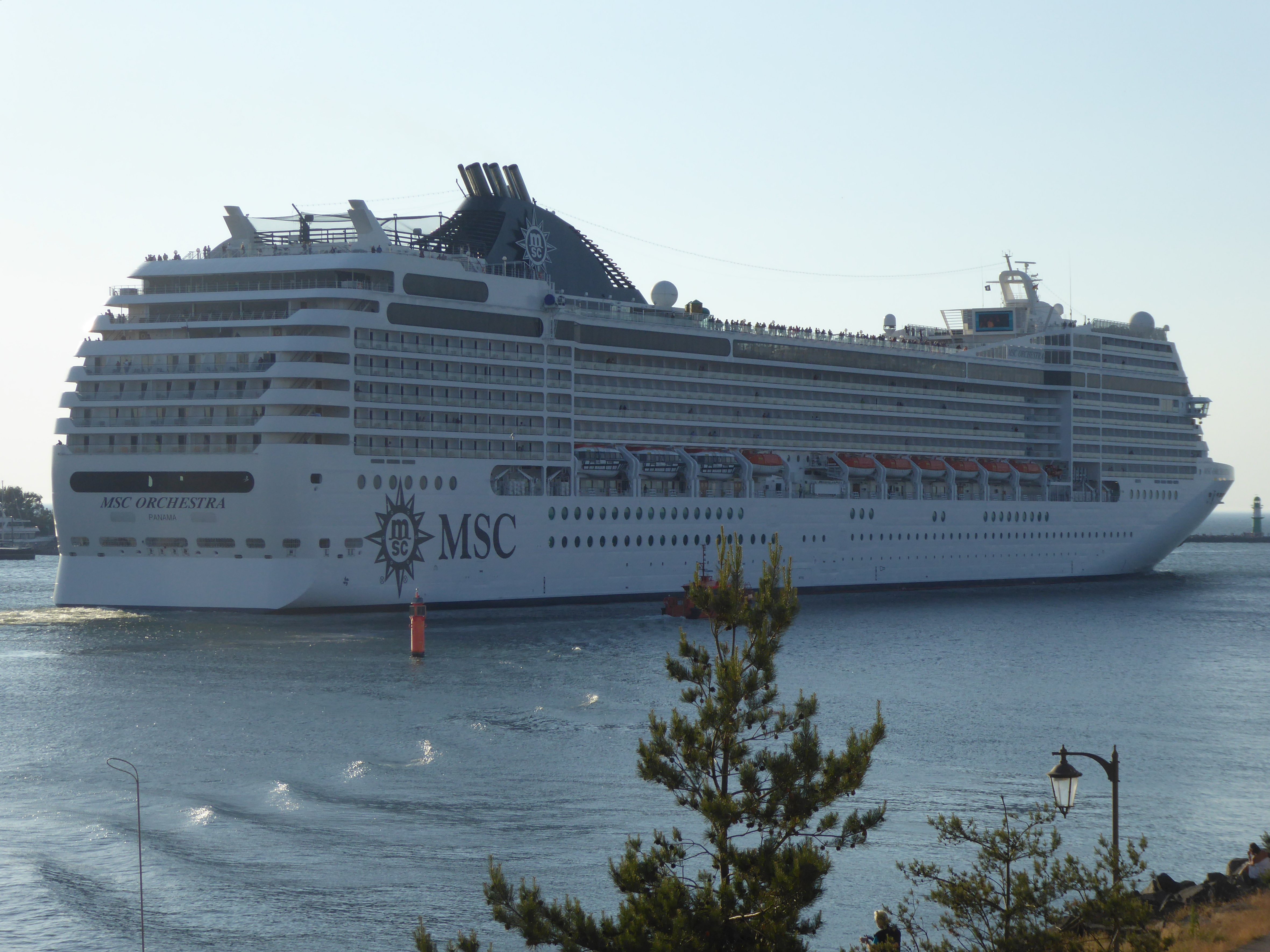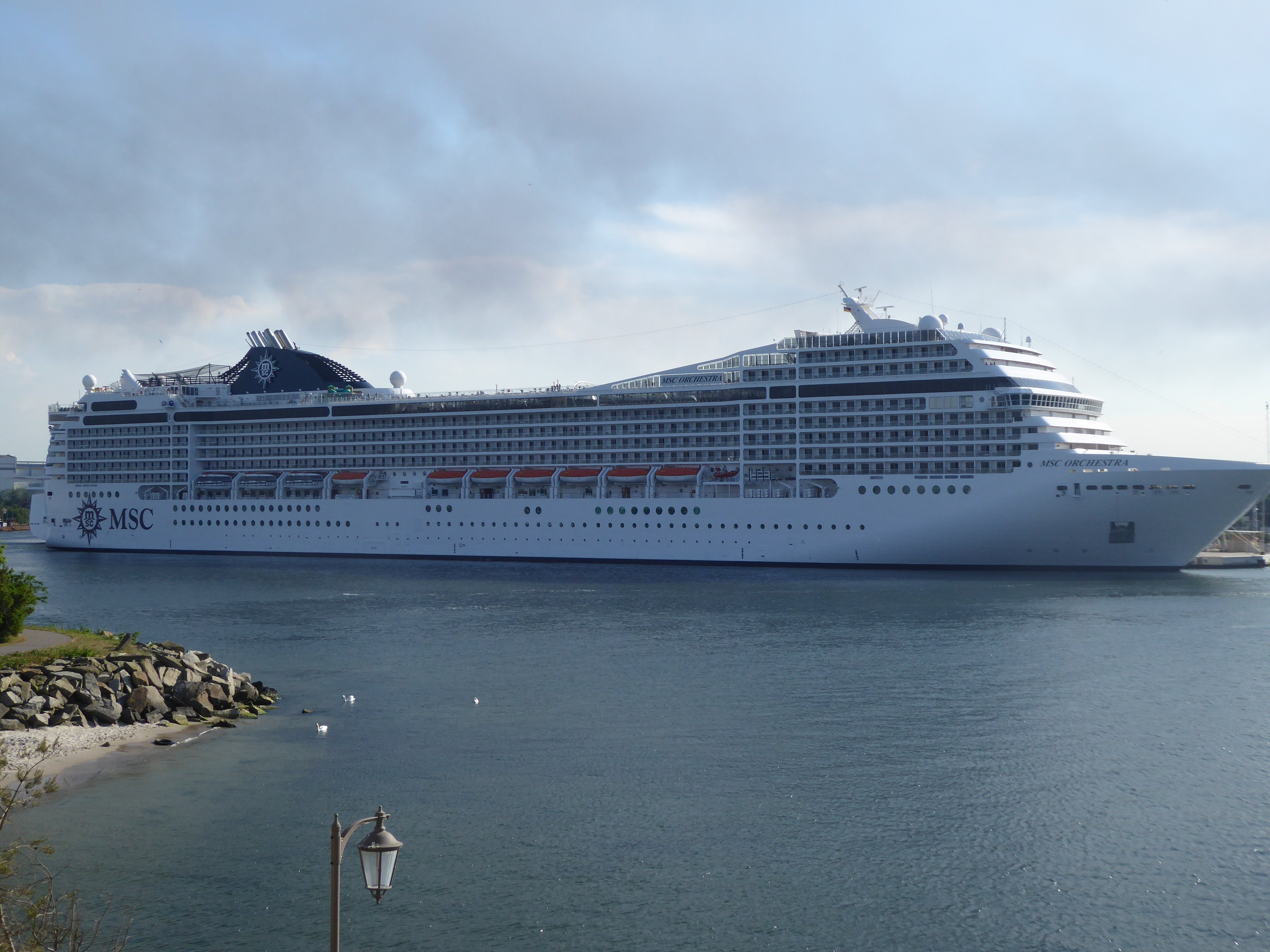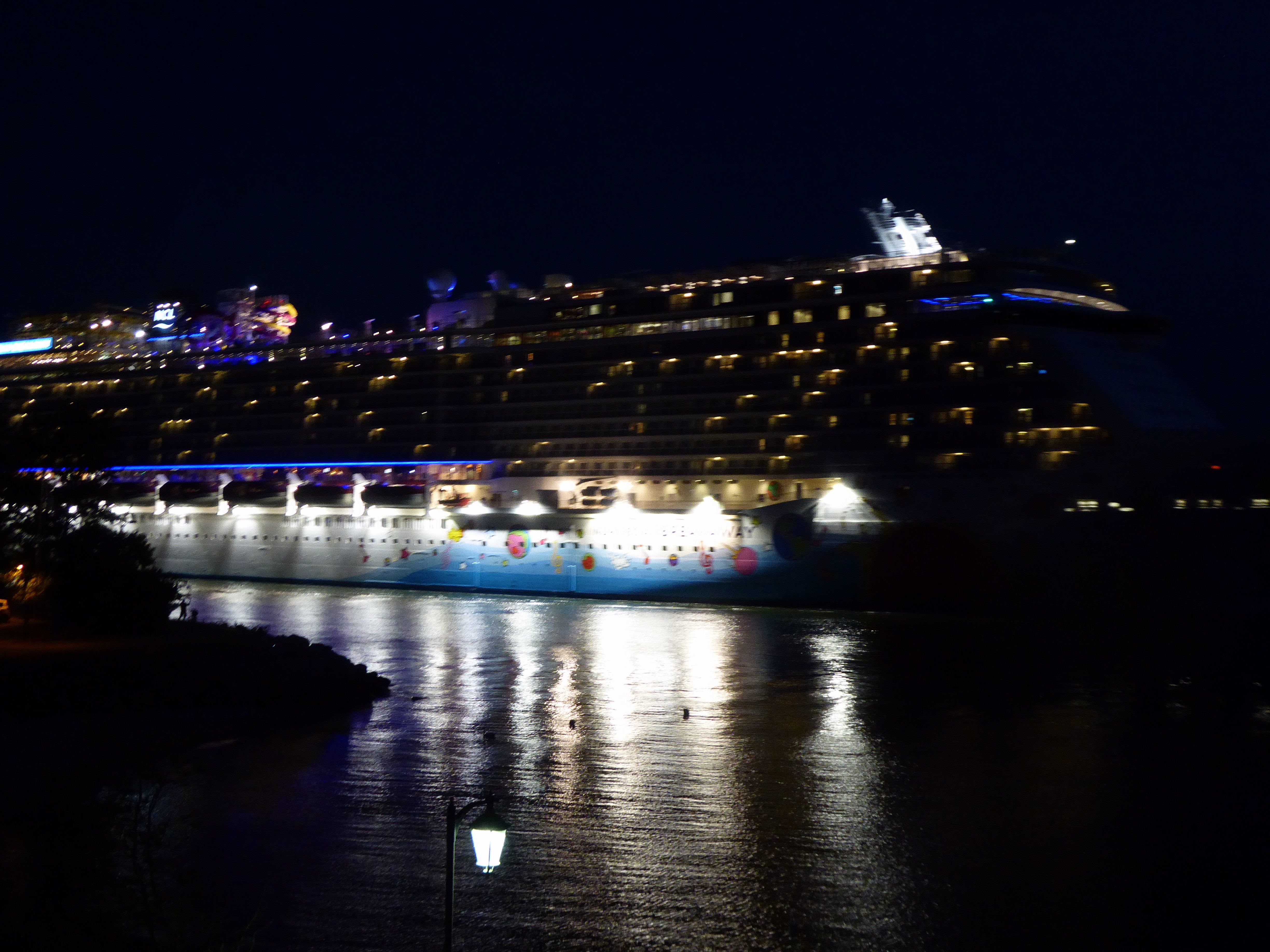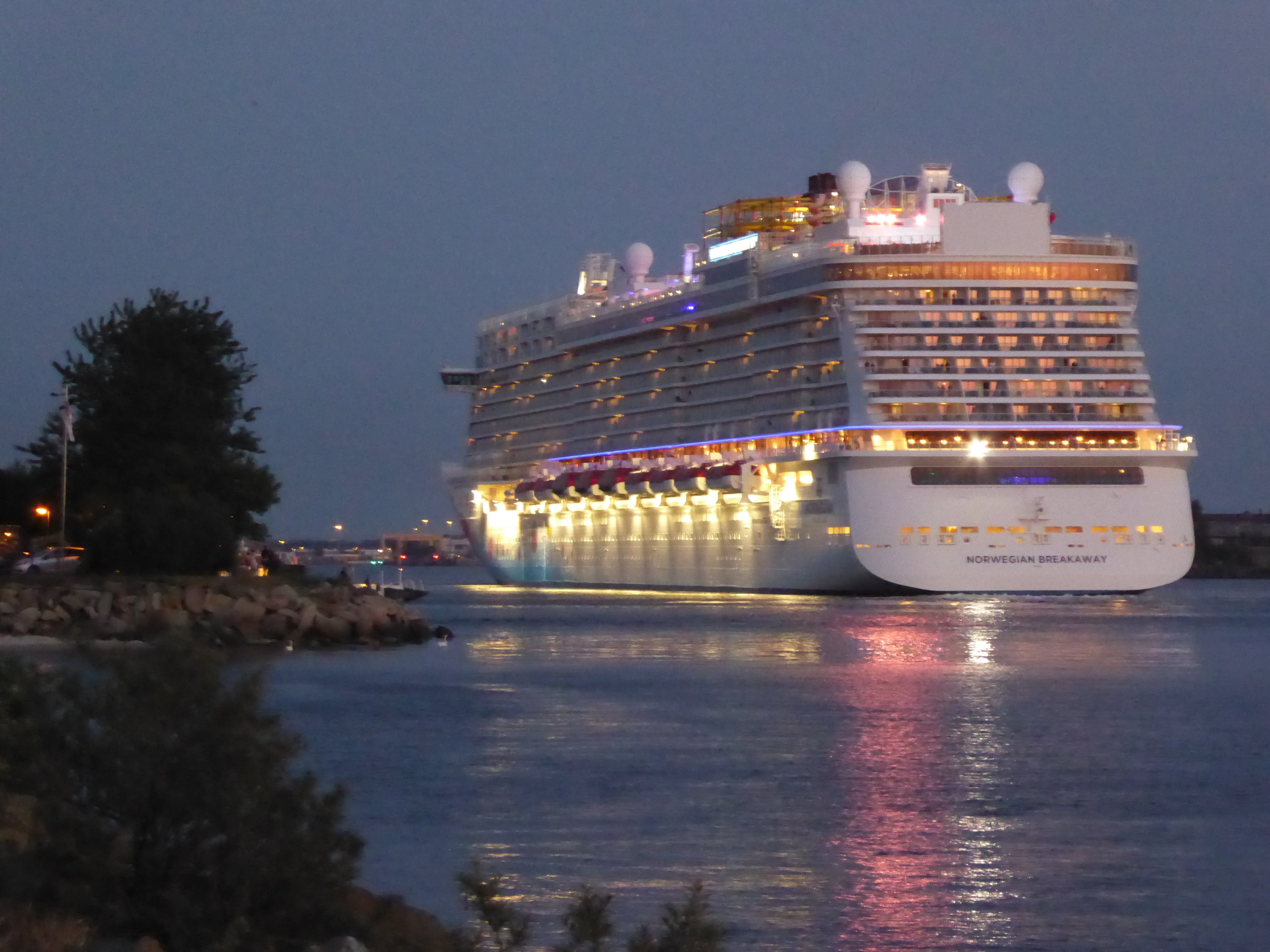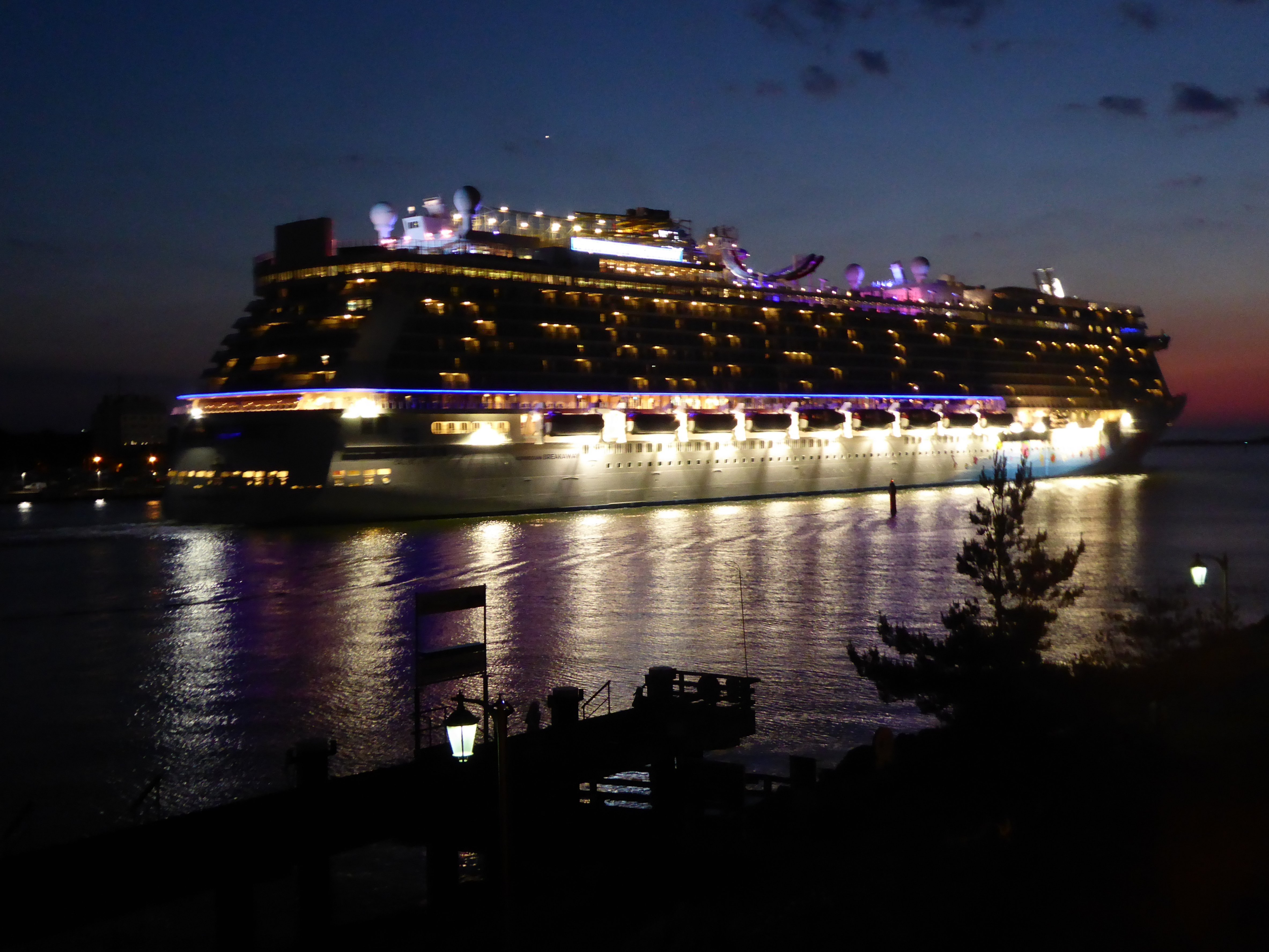 Begleitet von einem deutschen Volkslied verlässt die Orchestra den Hafen und gibt den Blick auf die NCL Breakaway frei, die den Tag am LP8 verbracht hat.