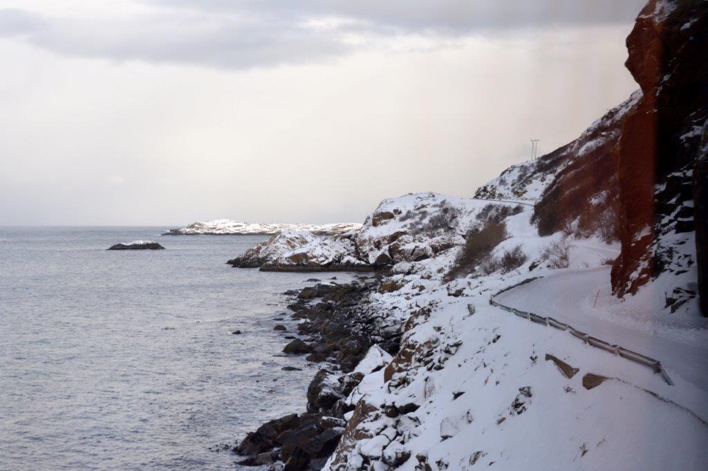 Das Wetter wusste nicht so richtig, wie es werden sollte. Es gab alles: dicke, Schnee androhende Wolken, aber dabei sollte es zunächst bleiben. Die Sonne wie auch blauer Himmel zeigten sich weniger als zuvor. An der Hinnøya-Uferlinie sahen wir ab und zu Häuseransammlungen. Nicht allzu viel – es waren Streusiedlungen.