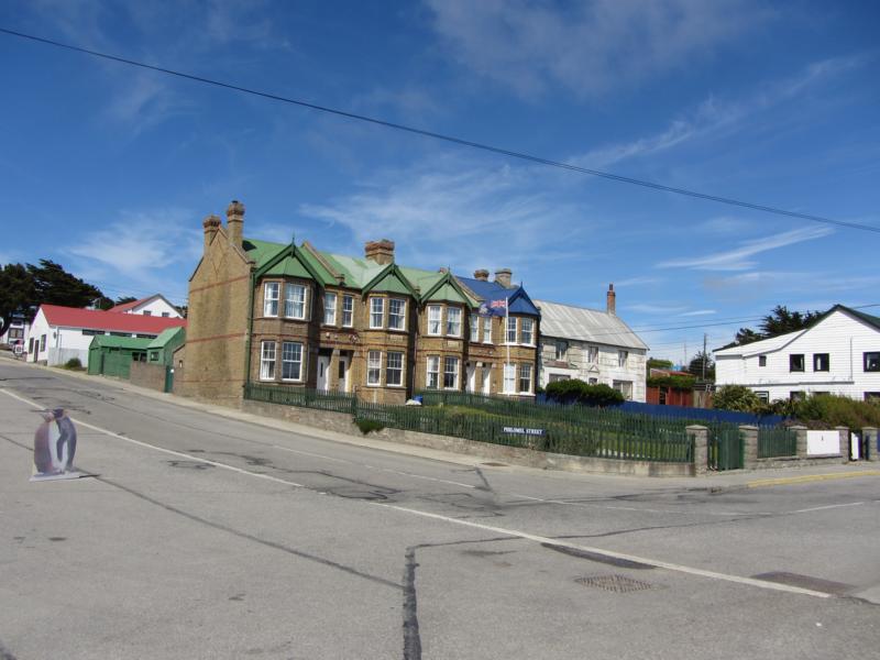 Dies Mahnmal erinnert an die Seegefechte vom 8. Dezember 1914 zwischen der britischen und deutschen Flotte in den Gewässern rund um die Falkland Inseln herum. Geschichte, egal wohin wir laufen. Das Haus und Büro des Gouverneurs stammt aus der Zeit um 1840 herum, sehr schön anzusehen. Überhaupt sehen wir viele typische Landhäuser der Kolonialisten. Diese Landhäuser mit ihren Wellblechdächern und bunten Fassaden passen in diese Landschaft. Natürlich haben wir auch das einzigste Backsteingebäude auf der Insel gesehen, das Stanley Cottage. Und überall wehen die britischen Flaggen im Wind.