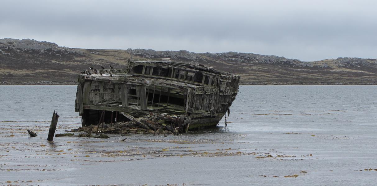 Wieder in Richtung Stanley kommen wir am Wrack der „Lady Elisabeth“ vorbei. 1879 lief dieser mit seinen drei gusseisernen Masten versehene Segler in Sunderland vom Stapel und kam 1913 schwer beschädigt durch die Felsen im Berkeley Sound in Stanley an. Lange wurde das Schiff noch als Lagerraum genutzt, bis es von seinen Bojen losbrach und zur jetzigen Stelle getrieben wurde.