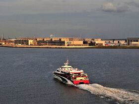 Wir verlassen Altona und schippern flussabwärts entlang der Elbchaussee an Steuerbord und Airbus Industries an Backbord, wo wir dem von Helgoland zurückkehrenden Highspeed Katamaran „Halunder Jet“ begegnen.