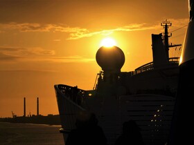 Aber statt „sail away“ aus den Lautsprechern zu hören, meldet sich noch einmal unser Kapitän Przemyslaw Kurc. Leider ist die Ansage sehr leise, zumal sie auch von der Kaffeemaschine der „Ocean Bar“ übertönt wird. Die wenigen Fragmente, die zu hören sind: „400 Meter lang“, „uns auf der Elbe entgegen kommend“ und „19:00 Uhr“. So bleiben wir erst einmal in Altona liegen und das Ablegen ist zunächst verschoben.