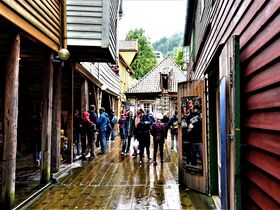 Zurück geht es durch die Haupteinkaufsstraße und über den Fischmarkt zu den Souvenirläden von Bryggen. Aber es gibt nichts Schönes oder ausgefallen Kitschiges und Kühlschrankmagnete von Bergen haben wir schon genug. So können wir nichts zu Bergens Bruttosozialprodukt beitragen.