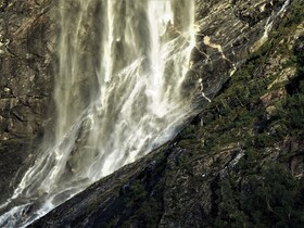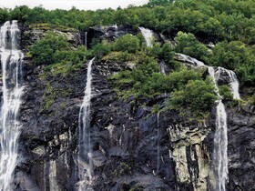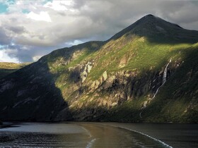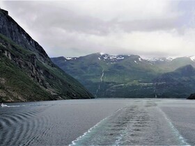 Um 9:00 Uhr fahren wir in den Geiranger Fjord, begleitet von dem Vortrag des Lektor und von klassischer Musik. Da wir Beides schon mehrfach genossen haben und heute die Sicht nun wirklich nicht toll ist, erwärmen wir uns lieber an der „Ocean Bar“ mit Latte Macchiato und heißer Schokolade. Außerdem ist der Platz ein wenig Wind geschützter, da es kalt und regnerisch ist. Auch die „sieben Schwestern“, wovon nur vier zuhause sind, plätschern ziemlich lustlos den Berg hinab in den Fjord.