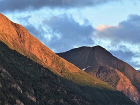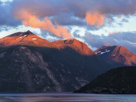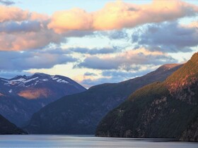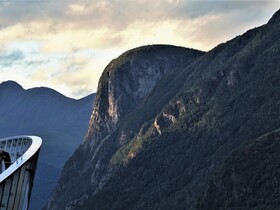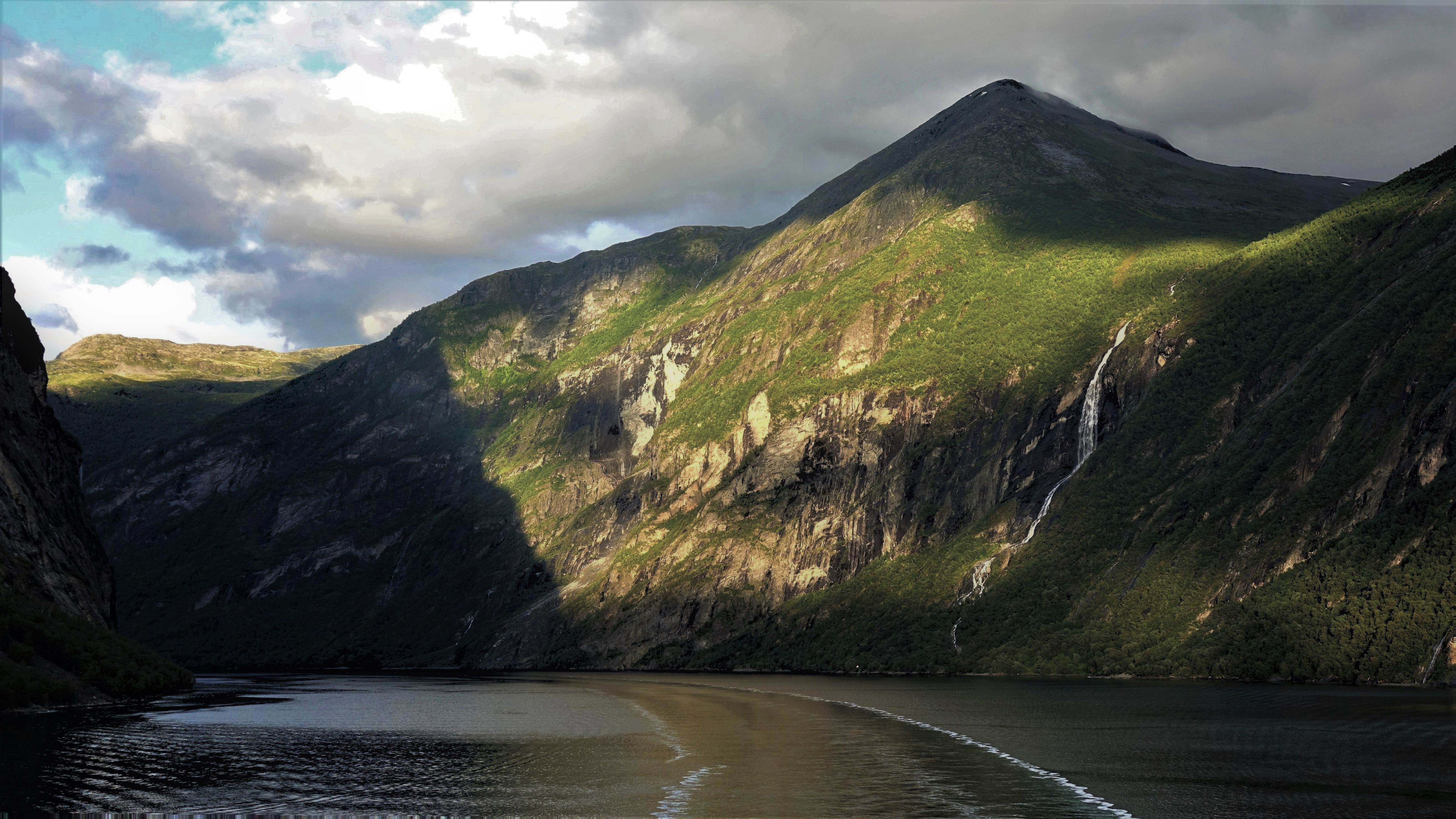 Um 20:00 Uhr heißt es „Leinen los“. Und jetzt sind da auch ein paar Sonnenstrahlen, die aber aufgrund der Enge der Fjorde und der Höhe der Berge zuletzt nur noch die Spitzen erreichen. Diese abendliche Fahrt durch den Geiranger Fjord und die anderen Fjorde mit dem „langen Licht“, das die Landschaft sehr plastisch erscheinen lässt, ist für uns immer wieder ein Grund nach Norden und nach Norwegen zu reisen. Es ist eine sehr schöne und geruhsame Stimmung und jeder, der so einen Abend miterlebt hat, weiß, warum es uns nach draußen zieht. Aber als wir um Mitternacht bei ziemlicher Dunkelheit Ålesund und damit das offene Meer erreichen, endet leider auch dieser Abend.