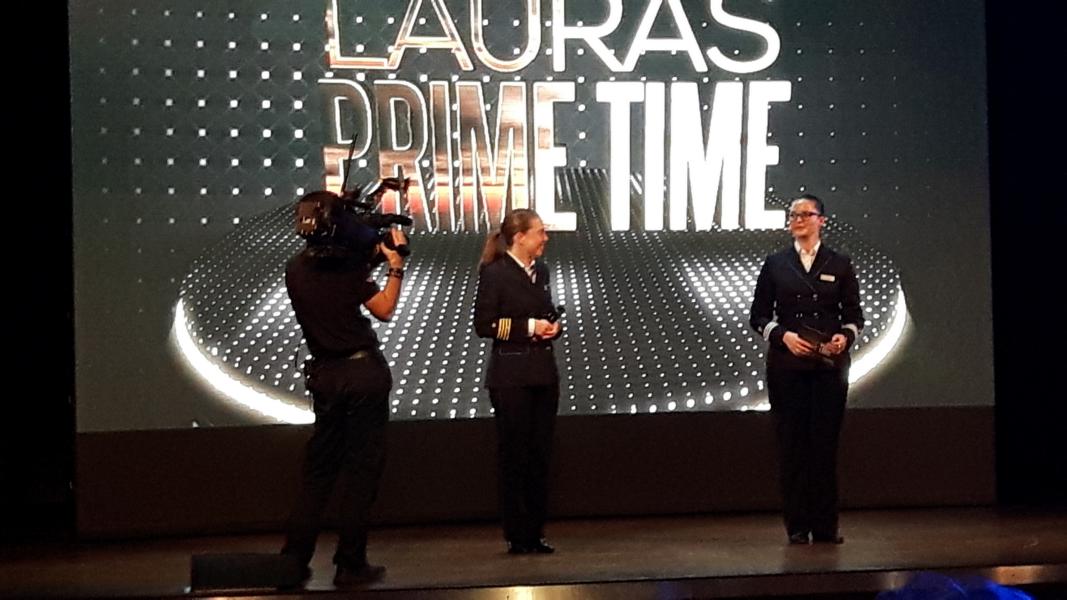Ich flitze zwischendrin in Richtung Theater, denn in Lauras PrimeTime ist heute Frau Kapitän Nicole Langosch zu Gast. In der Ankündigung war zu lesen, sie wird ihre spannenden Geschichten und Erfahrungen zum Besten geben. Wir schauen uns das nachher auf der Kabine an, wenn die Wiederholung ausgestrahlt wird. So, das Fotos gemacht, ich höre kurz zu und dann aber fix zurück an den Tisch.