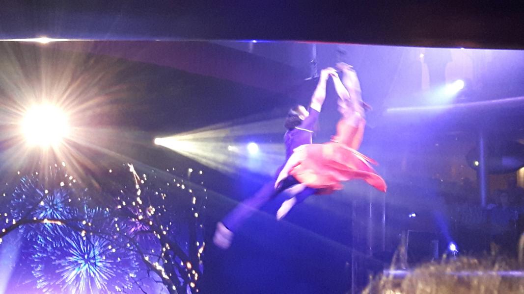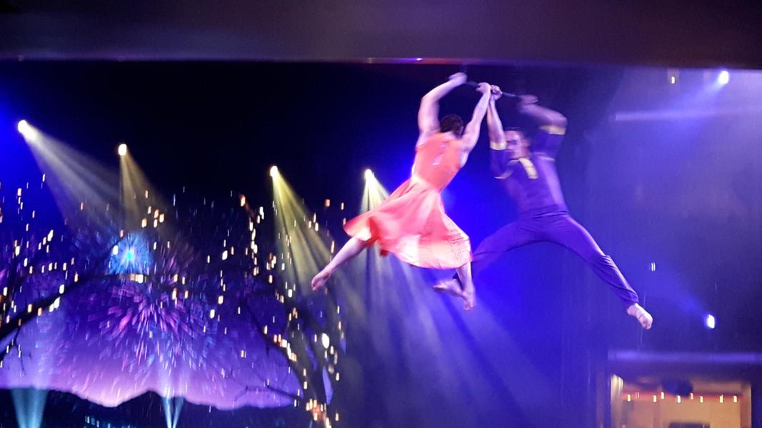 Fast zum Schluss der Show „Musical Dreams“ treffen wir im Theater ein. Sehen noch die fantastischen Artisten, wie sie elegant in luftiger Höhe schweben. Sie sind so schnell, dass mein Handy sie nur schemenhaft erwischt.