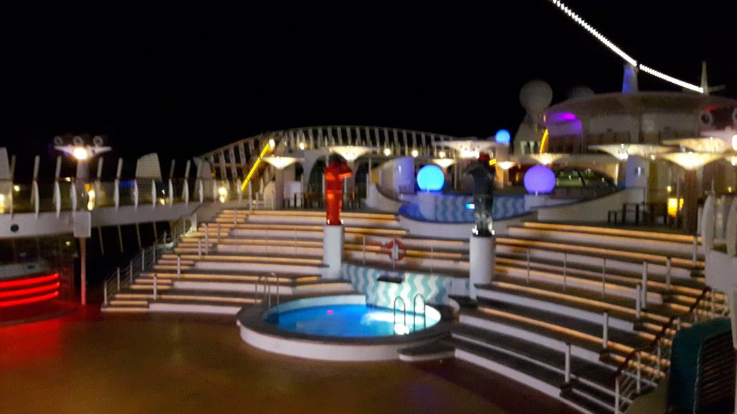 An der Poolbaar trinken wir noch einen kleiner Absacken und machen uns auf den Weg zum Fahrstuhl - aber nicht, ohne einen Blick in die Anytime zu werfen. Ja, da geht die Post ab. Karnevalsparty, verkleidete Menschen tanzen und an der Bar ist alles für das U-Boot aufgebaut. Irgendwie sehe ich alles verschwommen bzw. ich habe wohl versehentlich die Linse verschmiert. Egal, ich nehme das Foto trotzdem für den Reisebericht. Niemand ist perfekt oder?