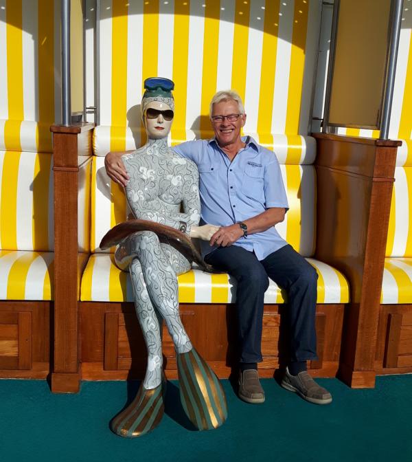 Die zwei großen Figuren auf dem Pooldeck halten Ausschau, Wetter gut und es gibt noch soooo viele freie Liegen. In den großen Strandkörben sitzt eine Dame und mein Mann versucht sie in ein Gespräch verwickeln. Leider ohne Erfolg, sie zeigt ihm die kühle Schulter und schaut weiterhin geradeaus. Ich glaube, sie ist gerade von einem Tauchgang zurückgekommen und hat dem Koch des Rossini einen Fisch mitgebracht.