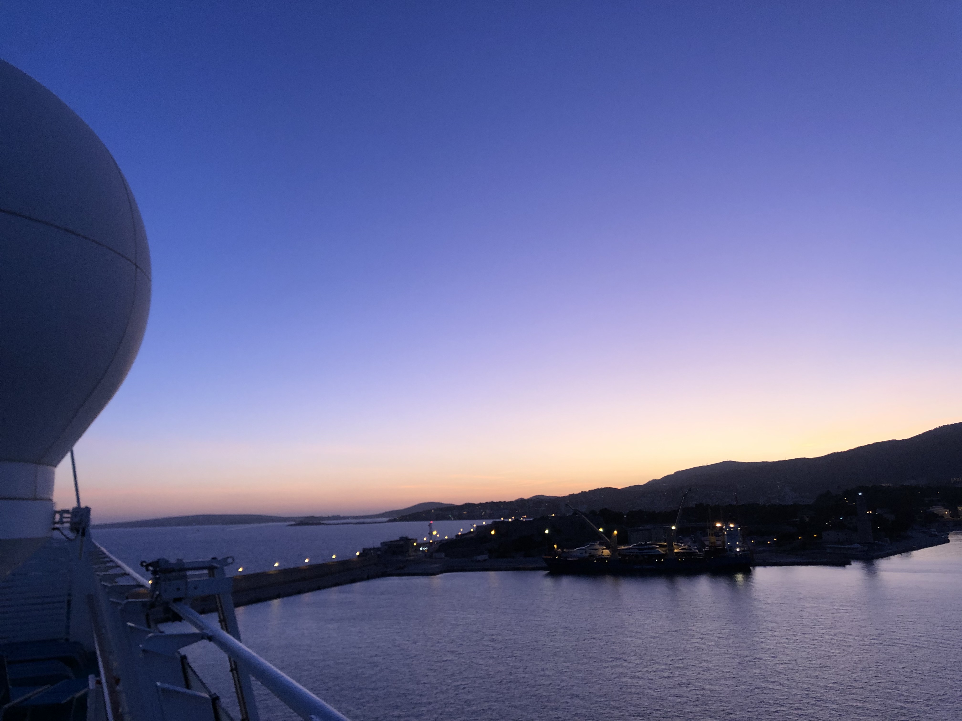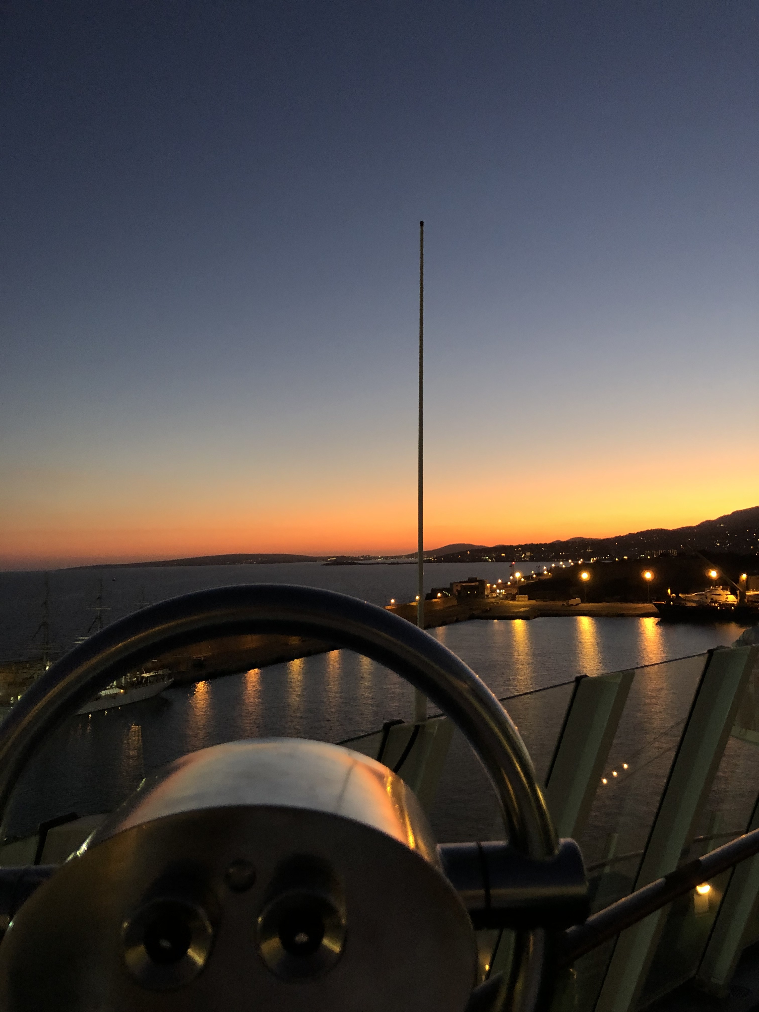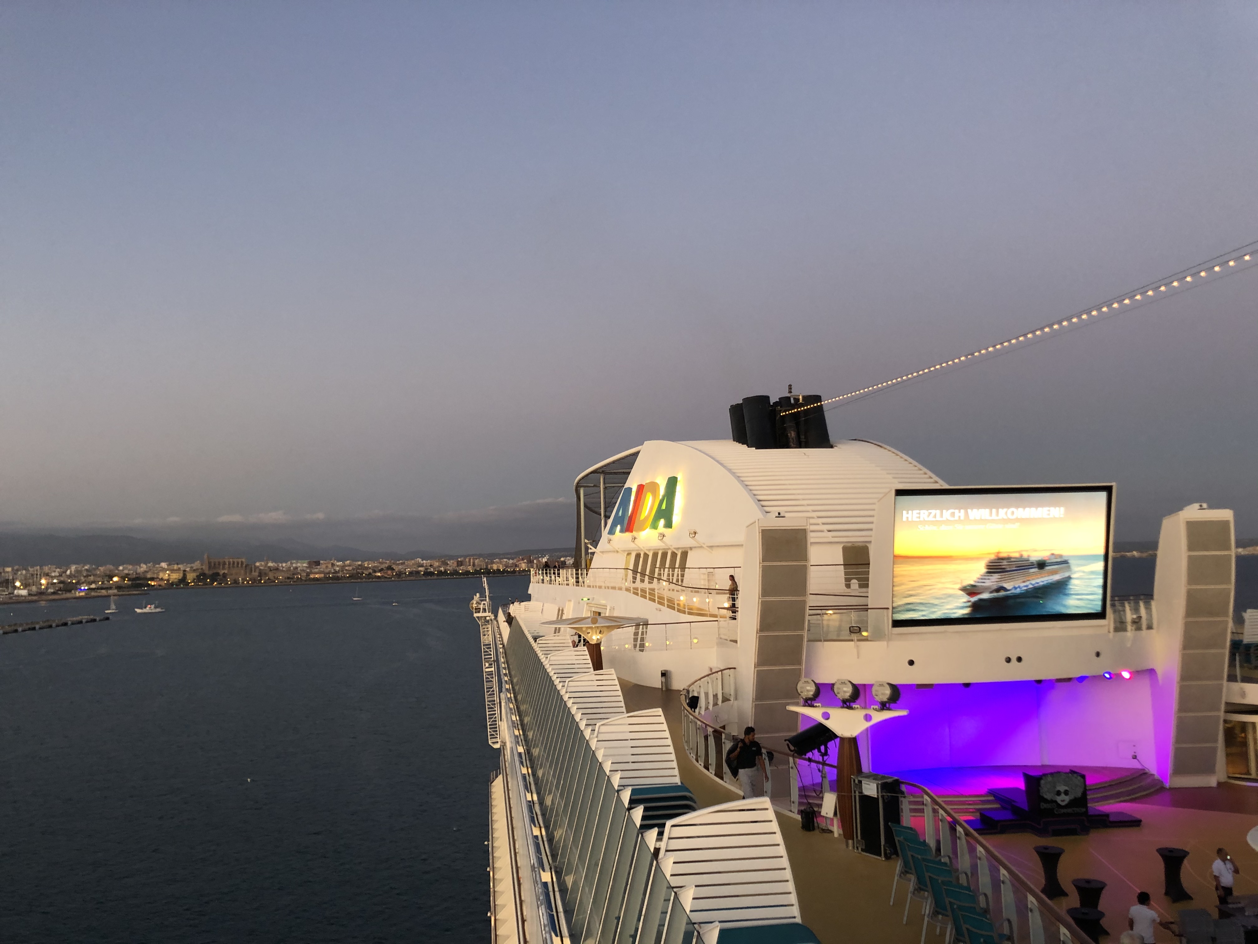 Wir haben noch etwas Zeit bis zur Seenotrettungsübung um 21:00 Uhr, die wir mit einem Verdauungsspaziergang über das mittlerweile beleuchtete Deck von AIDAstella verbringen. Nebenbei geht die Sonne endgültig unter und im Hafen und entlang der Küste wird immer mehr Beleuchtung eingeschaltet...