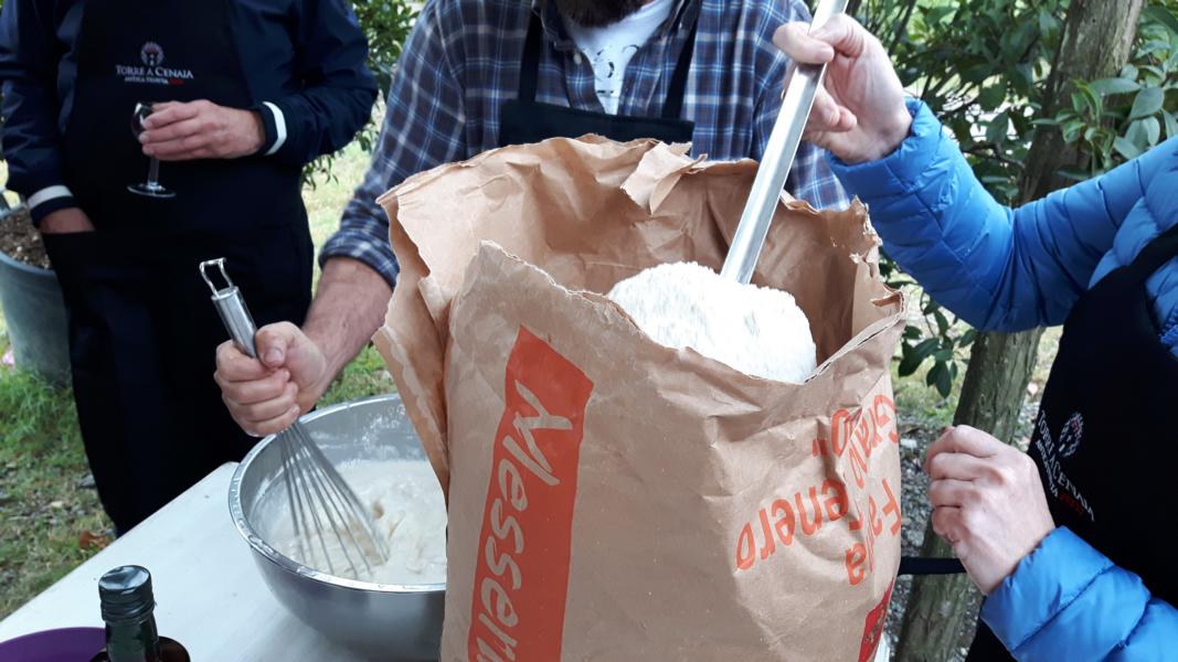 Der Winzer krempelt die Ärmel hoch, lauwarmes Wasser in einer großen Schüssel, Salz, Mehl und Olivenöl stehen bereit und schon wird der Teig für Focaccia vorbereitet. Er rührt und knetet und sagt einer Mitfahrerin „mehr, mehr“ als sie zögerlich das Mehl in die Schüssel gibt.
